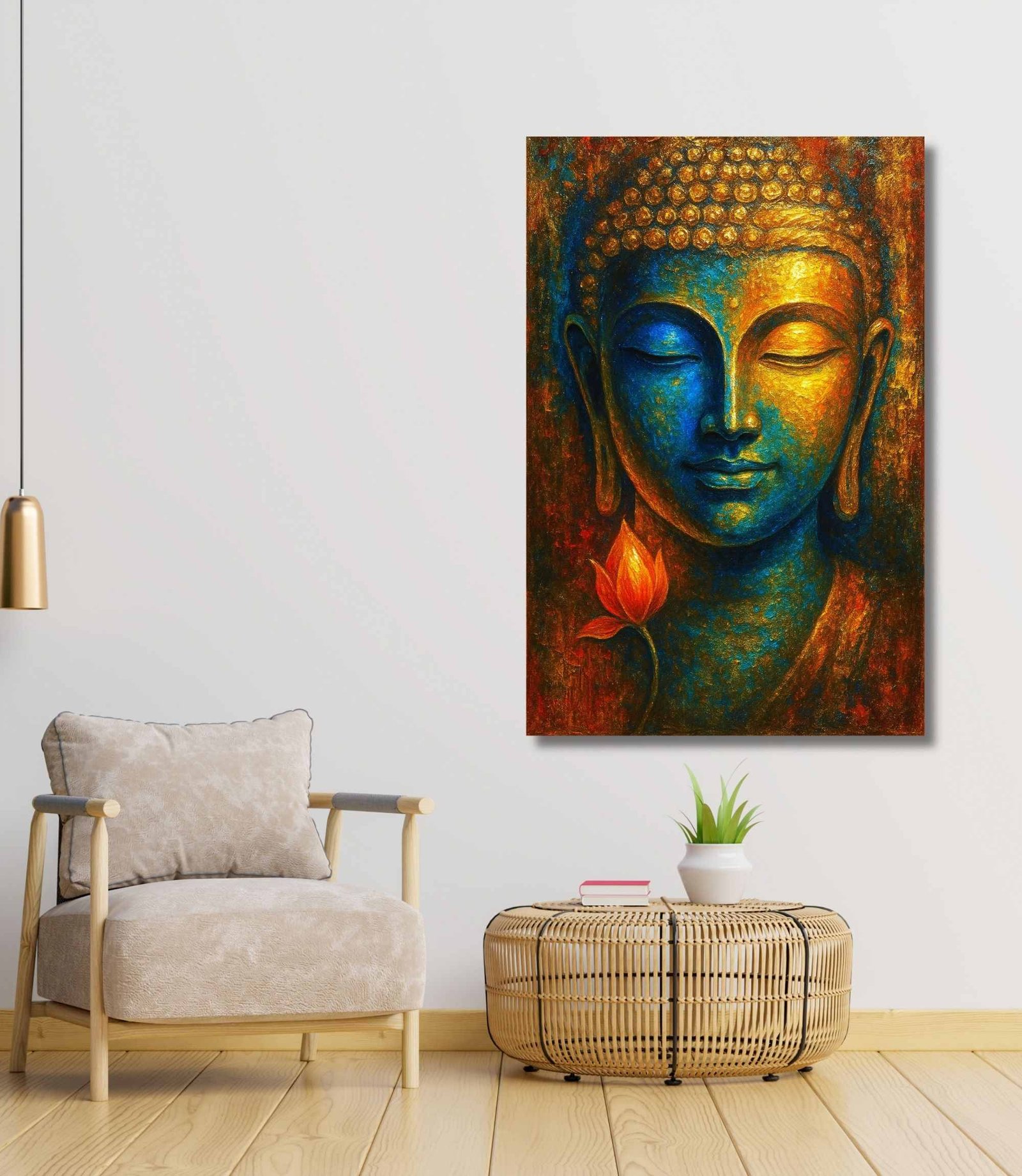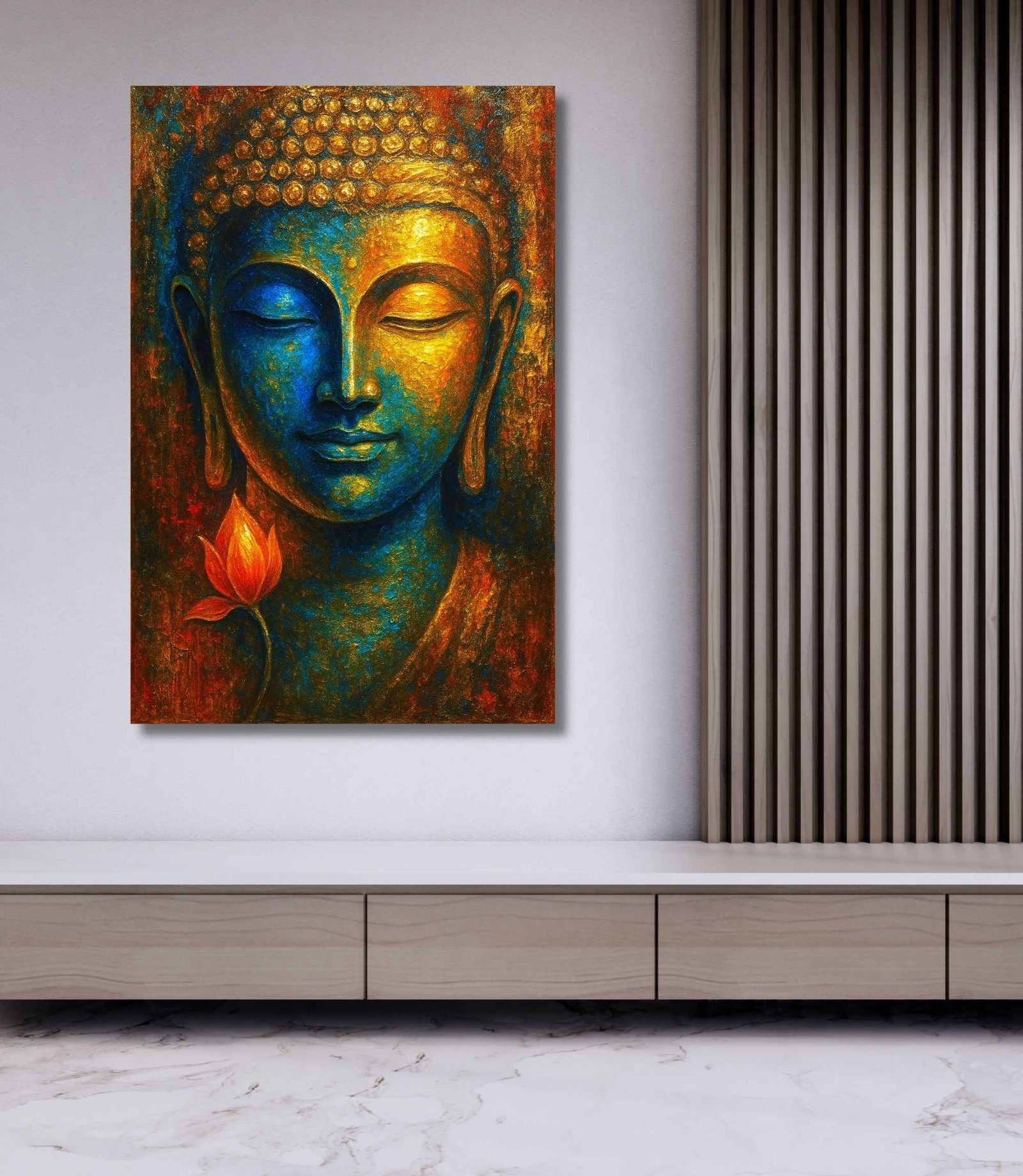Elevate the ambience of your home with this Buddha painting for living room from KunjCart, crafted in a stunning blend of blue and golden hues with subtle red highlights. The serene face of Gautam Buddha, painted in glowing abstract textures, brings a calming and spiritual essence to any space. A single orange lotus flower on the side adds symbolic beauty, signifying inner peace and purity. The artwork gives off a sunset-like shine with its rich contrast of warm and cool tones.