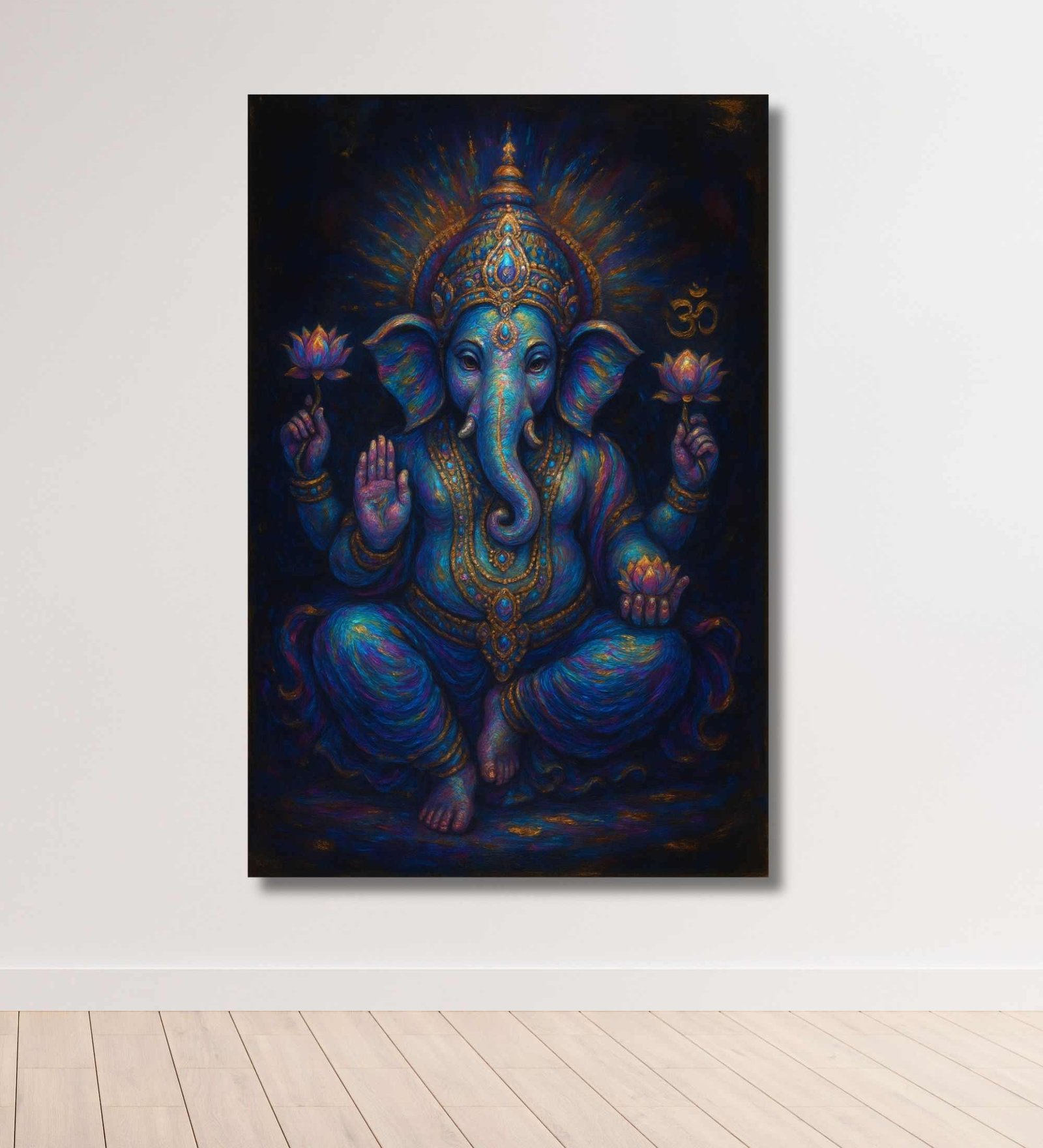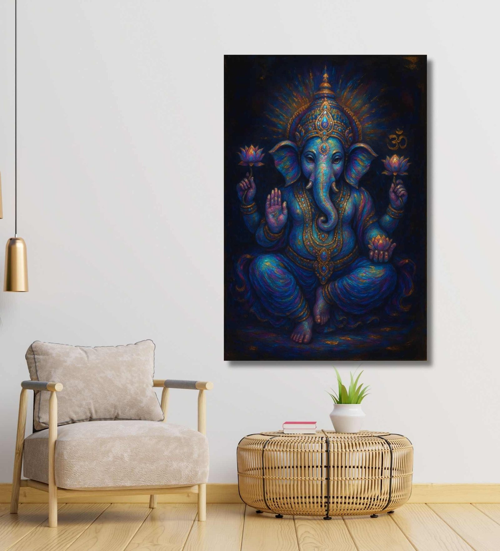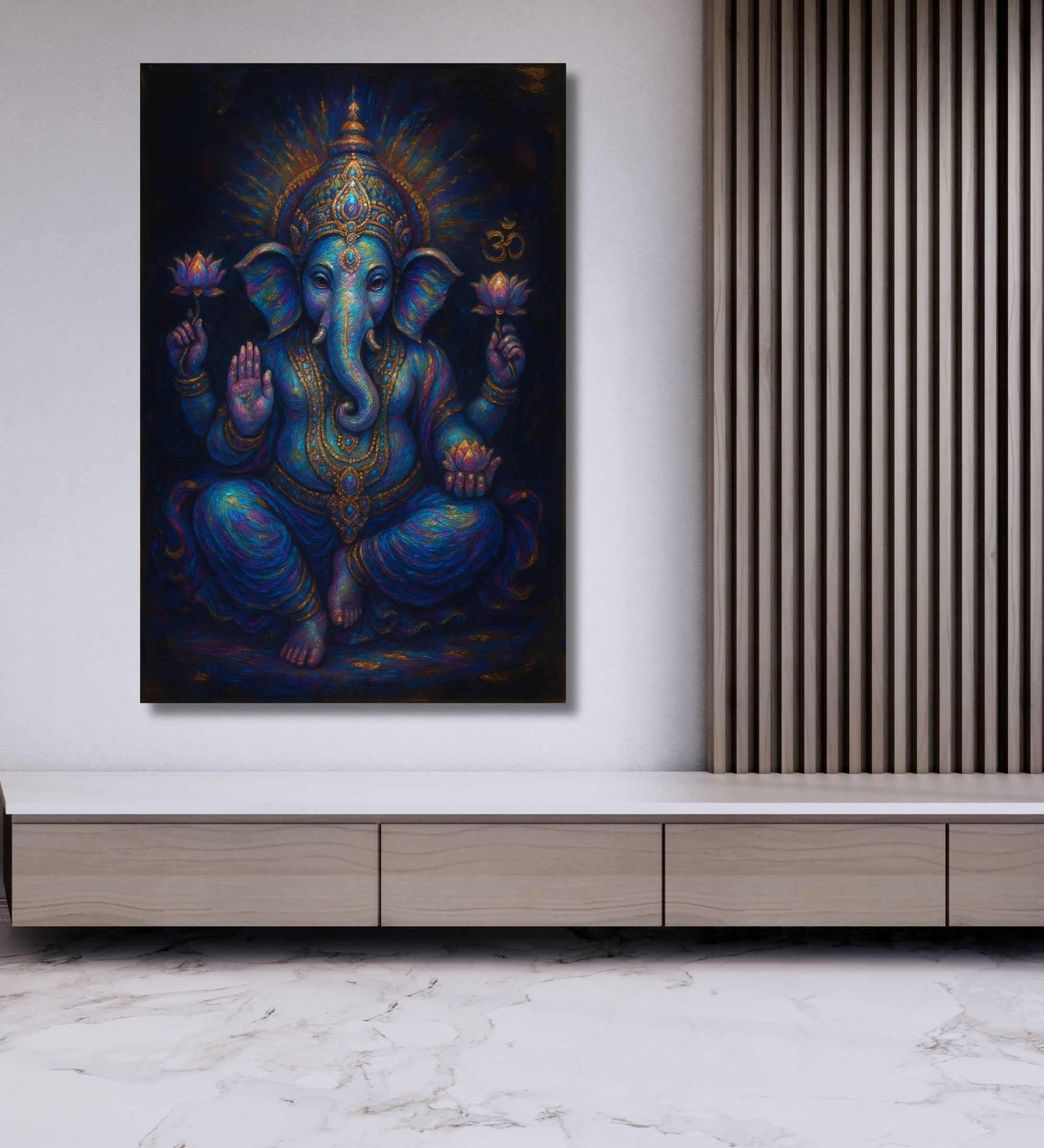 Infuse your space with spiritual elegance through this radiant Ganpati canvas painting by KunjCart. This artwork features Lord Ganesha seated in a meditative pose, surrounded by glowing dark purple, indigo, and blue tones, with divine golden highlights. The presence of lotus flowers, the sacred ‘ॐ’ symbol, and the halo of divine light make this a visually rich and spiritually charged piece of décor.
