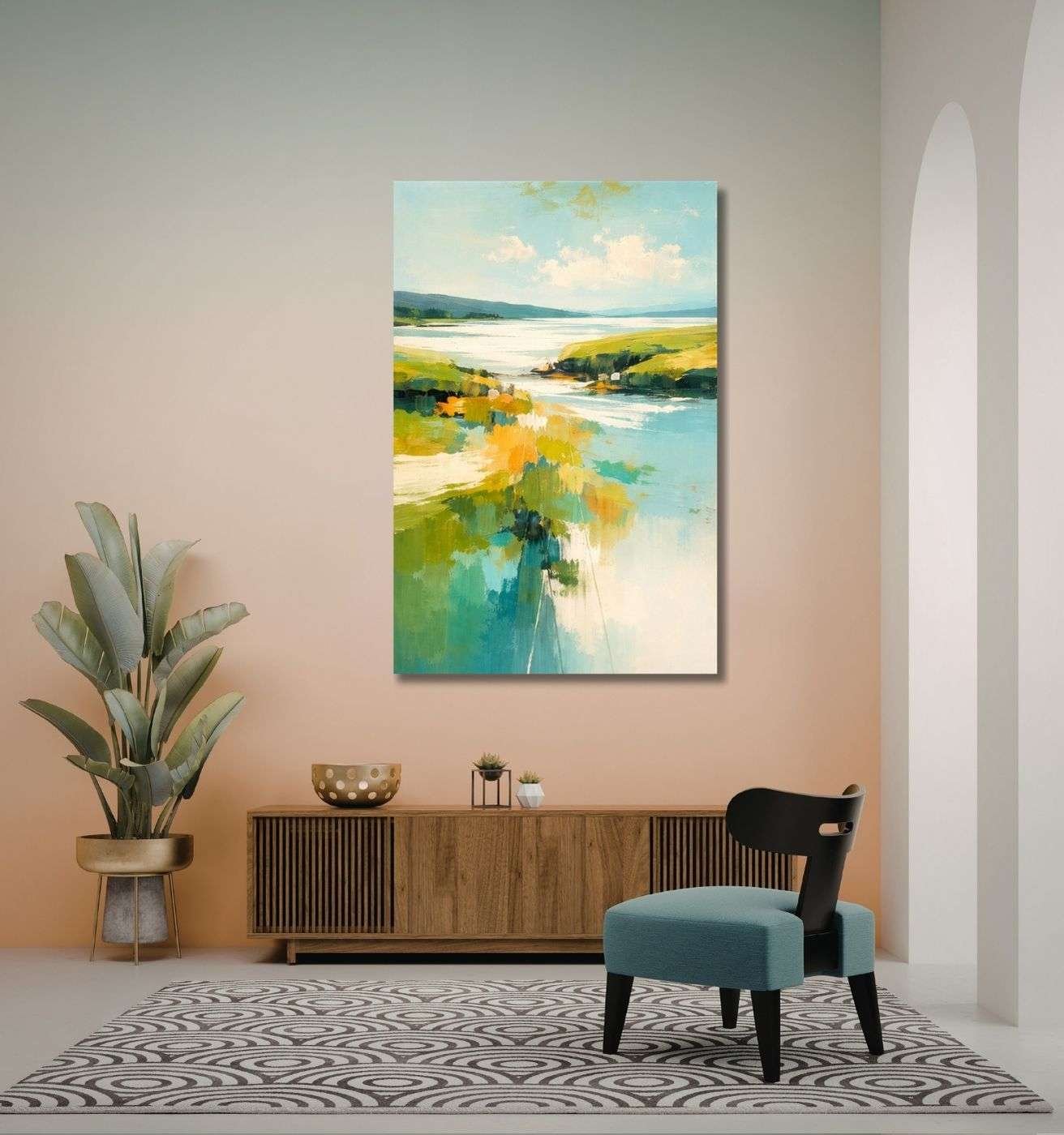 • Beautiful Modern Painting For Living Room featuring abstract lake landscape with blue water, green hills and sunlight tones.