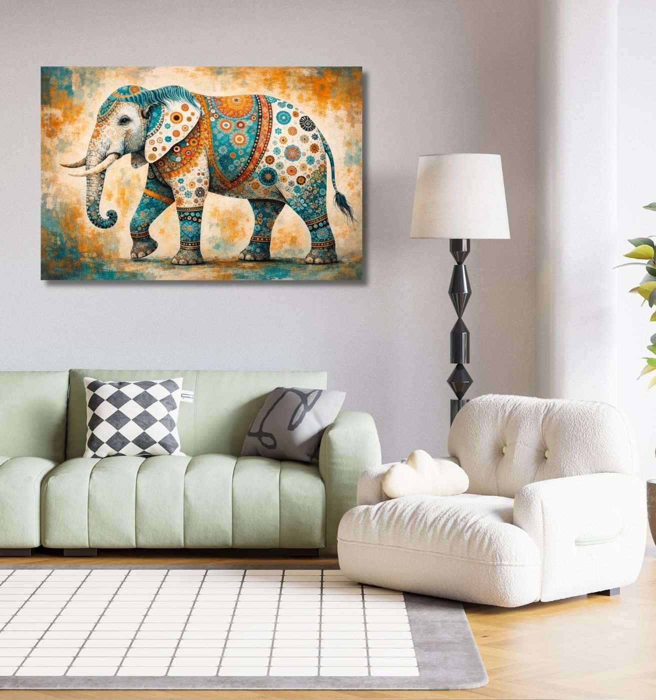 • Artistic Modern Art Canvas Wall Painting For Living Room featuring a colorful patterned elephant design with vibrant details.