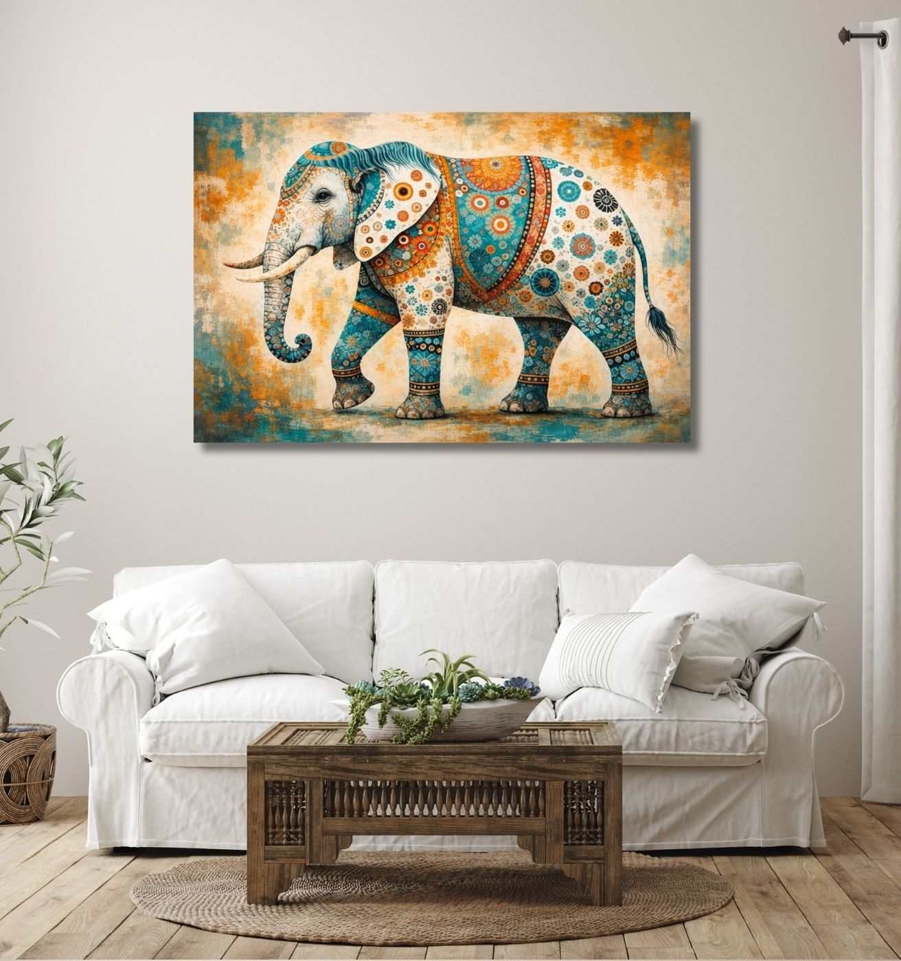 Bring culture and artistic charm to your space with this Colorful Elephant Modern Artwork Canvas Wall Painting For Living Room by KunjCart. This beautiful artwork features a majestic elephant decorated with vibrant floral and geometric patterns in teal blue, orange, and warm earthy shades. The detailed design and textured background create a lively and elegant atmosphere, making it a perfect statement décor piece. This Modern Art Canvas Painting is printed on durable 380 GSM premium canvas, giving it the feel of a real handmade painting rather than wallpaper. Colors are HD, waterproof, bright, and long-lasting. KunjCart offers framed or unframed options with multiple and custom sizes available.