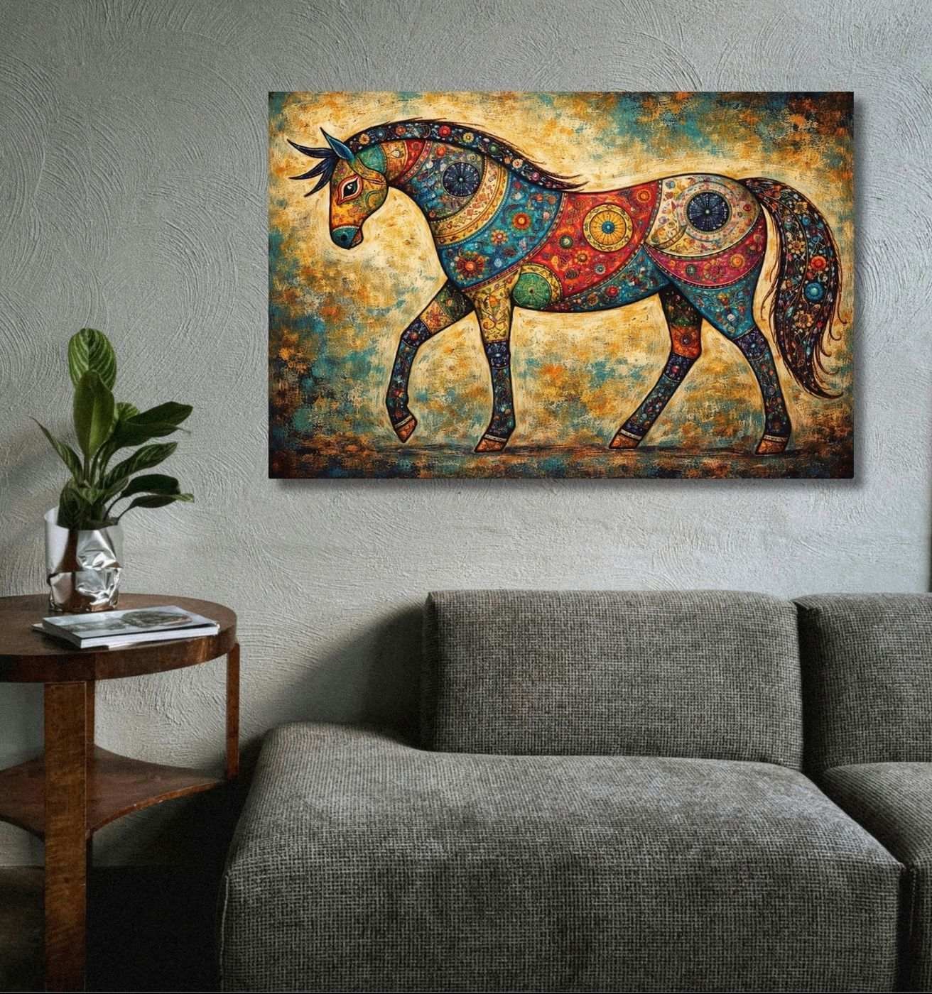 • Stylish Modern Art Canvas Wall Painting For Living Room featuring a colorful patterned horse with vibrant artistic details.
