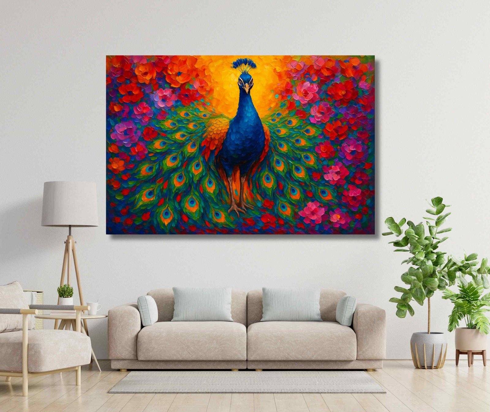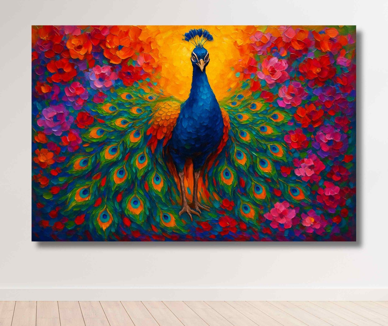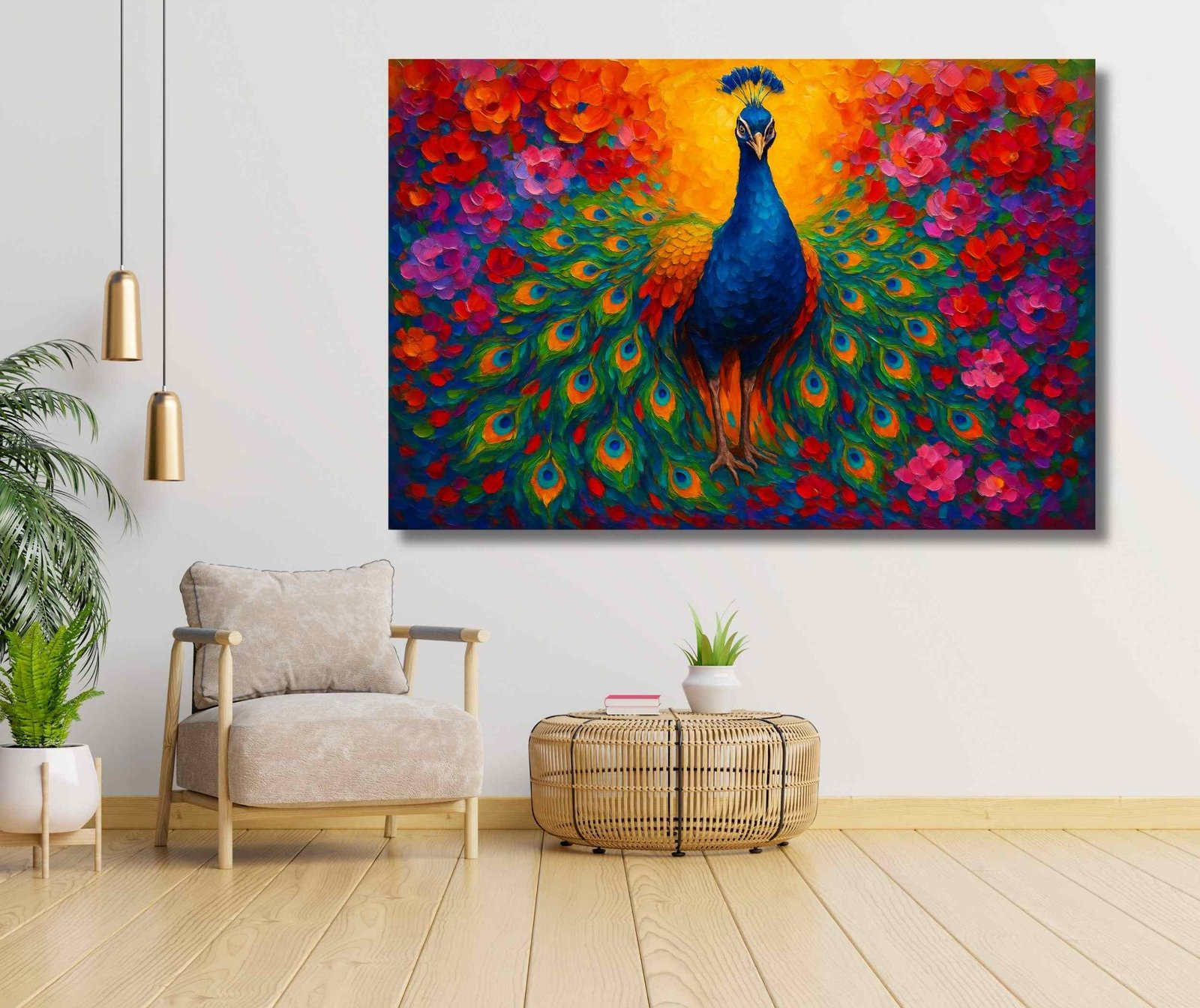 Enhance your wall décor with this vibrant Dancing Peacock Painting from KunjCart that brings color, movement, and beauty into any space. The artwork features a majestic peacock in full plumage, with striking green, blue, and orange feathers surrounded by a rich backdrop of blooming red, pink, and violet flowers. The glowing yellow halo behind the bird adds a shining, almost sunset-like warmth to the composition.