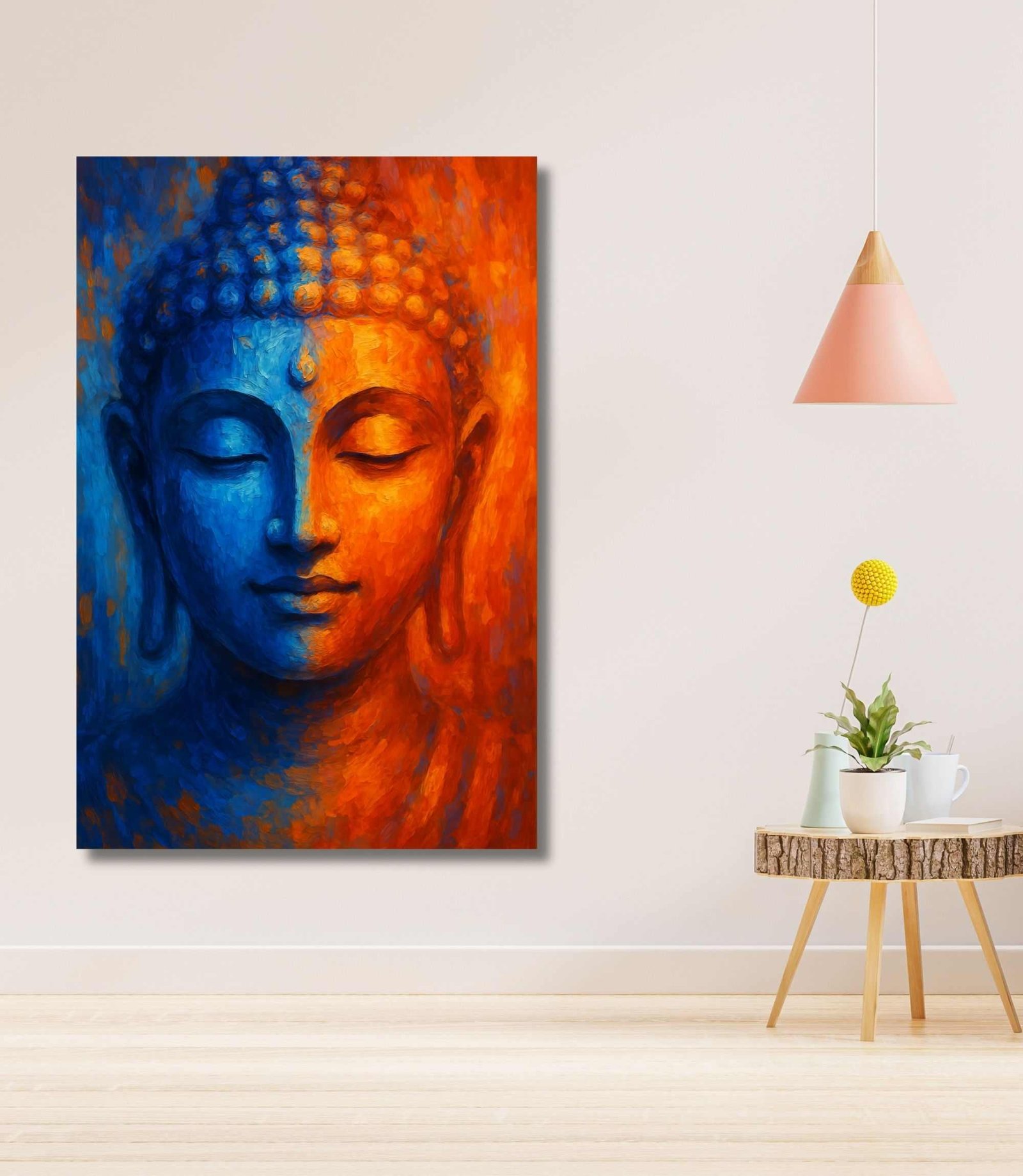 Bring calm and bold color contrast to your space with this modern Buddha canvas painting from KunjCart. The artwork features the serene face of Lord Gautam Buddha, uniquely split between vivid deep blue and radiant orange hues. The abstract brushstroke style blends into a soft gradient, symbolizing inner peace and balance between opposing energies—fire and water. The high-contrast tones paired with closed eyes create a harmonious visual appeal ideal for meditation spaces or statement living room walls.