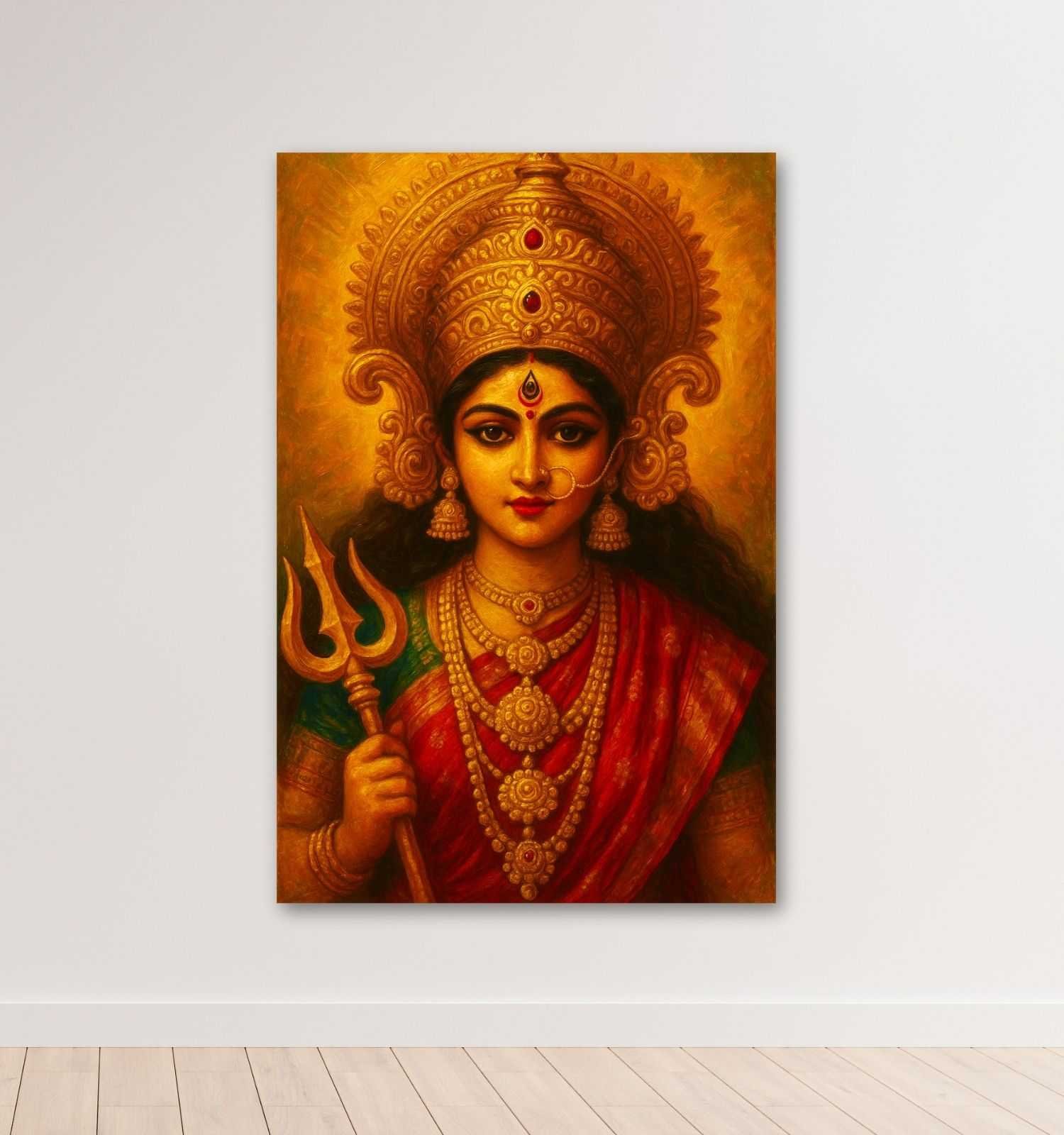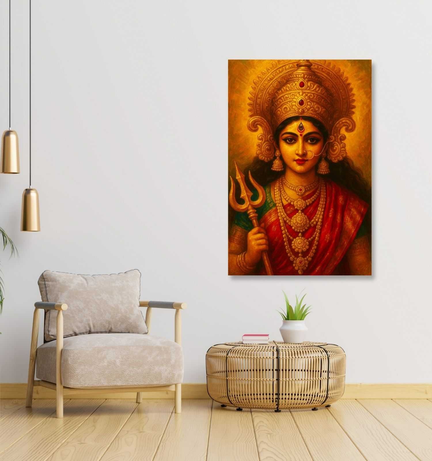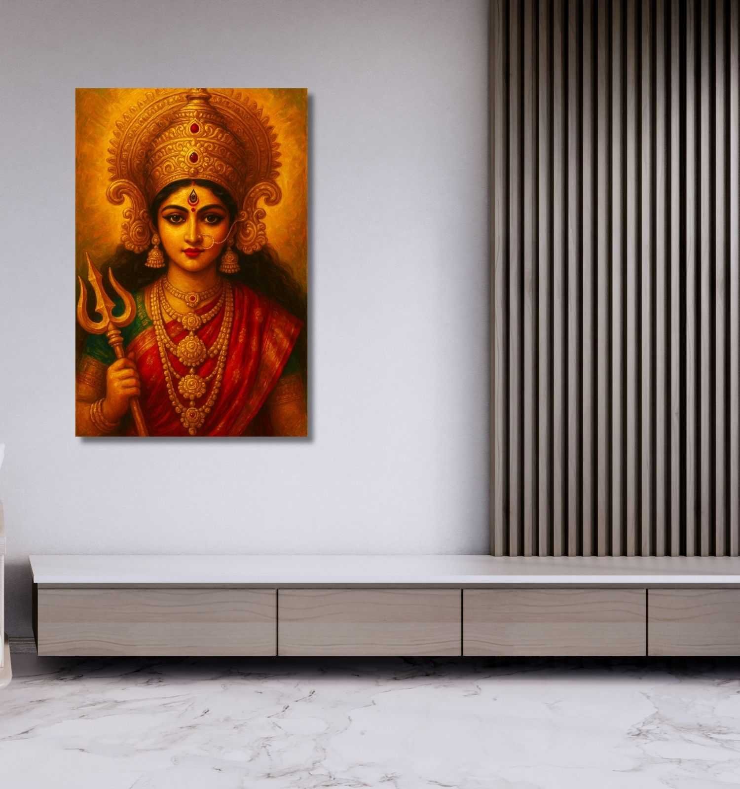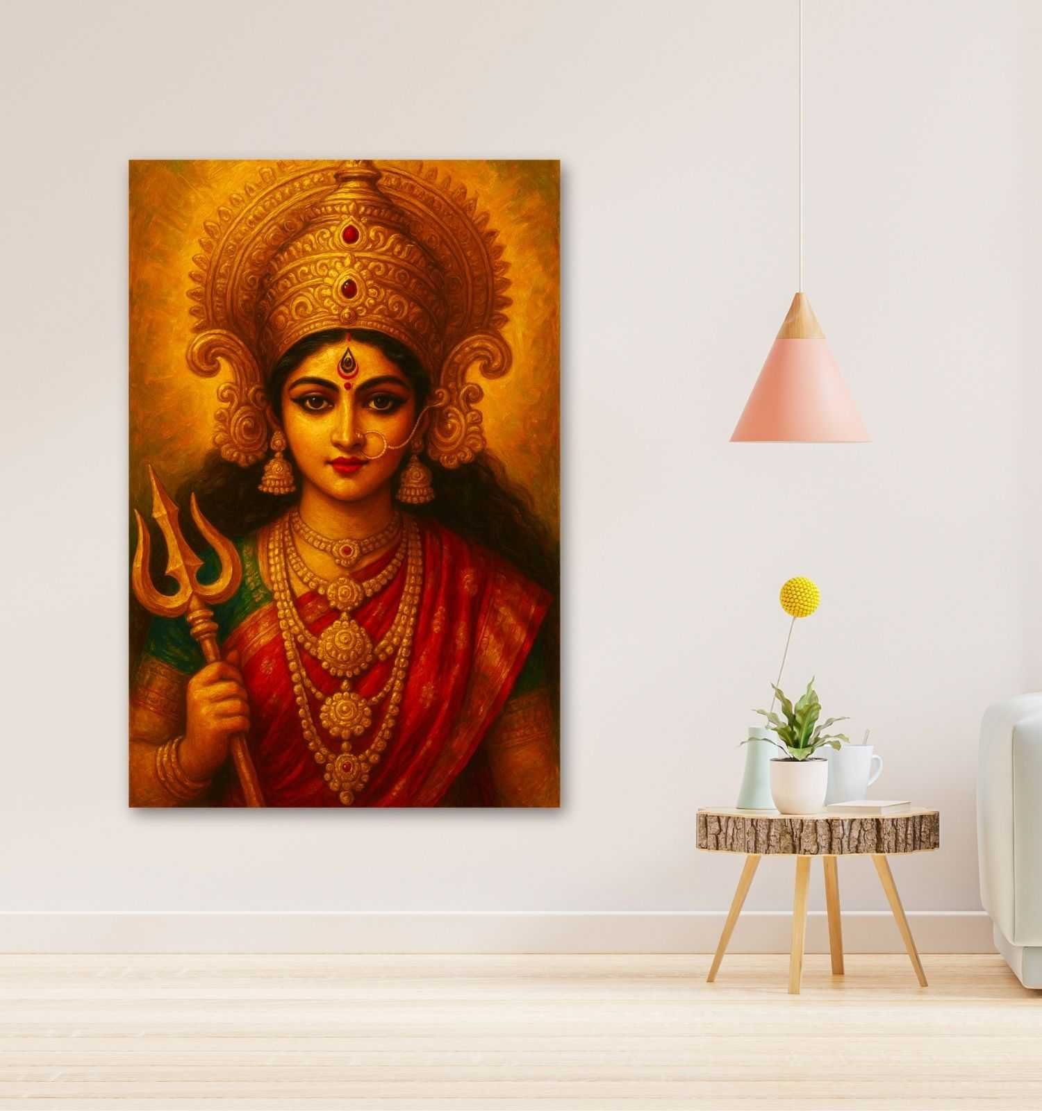Add a touch of divinity and strength to your walls with this Durga Canvas Painting by KunjCart. The artwork showcases a powerful image of Maa Durga holding a Trishul, dressed in red and green with layered golden jewelry and a detailed crown. The use of glowing golden, red, and earthy brown tones creates a majestic and traditional look, making it an ideal fit for sacred spaces or elegant décor themes.
