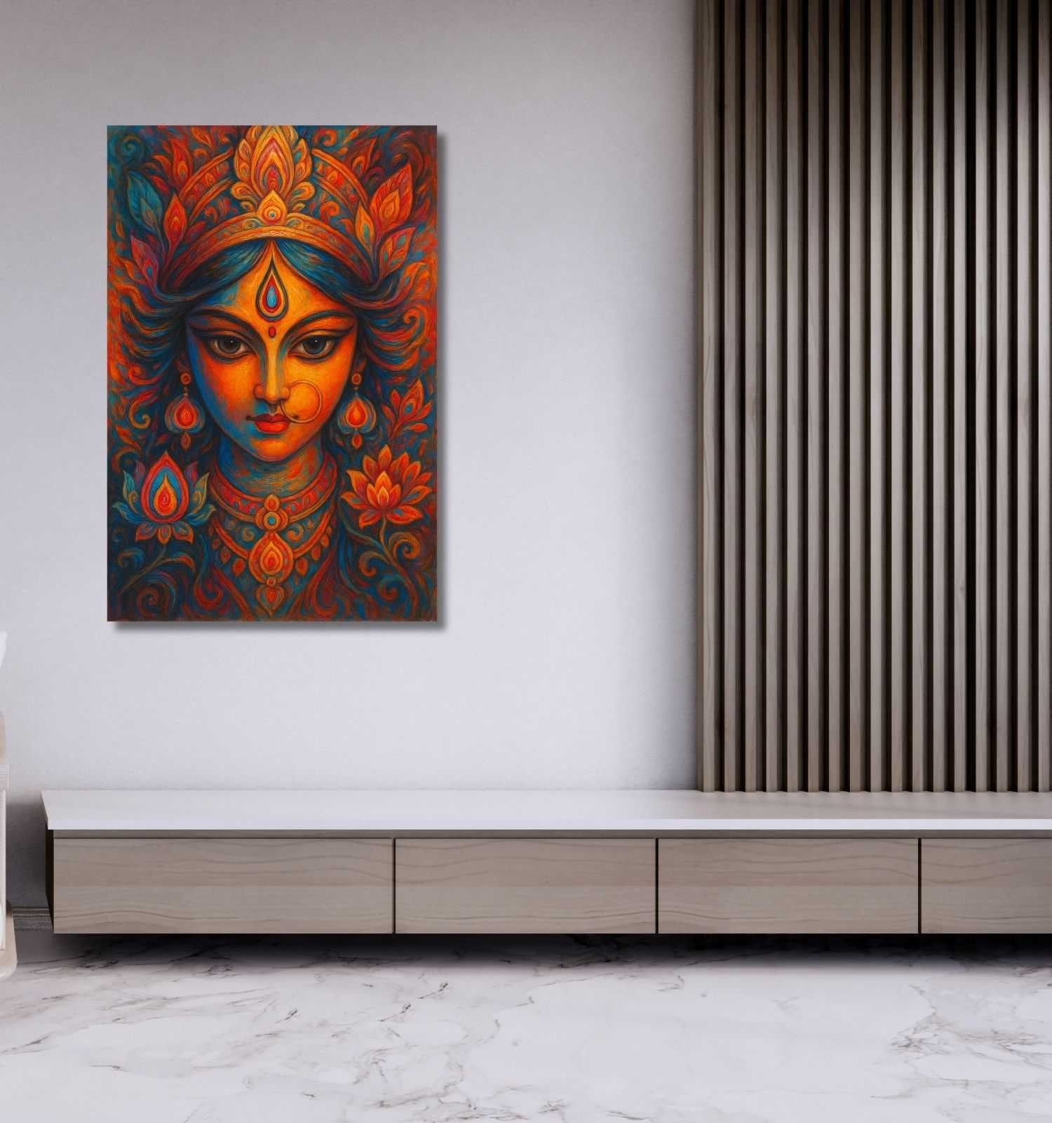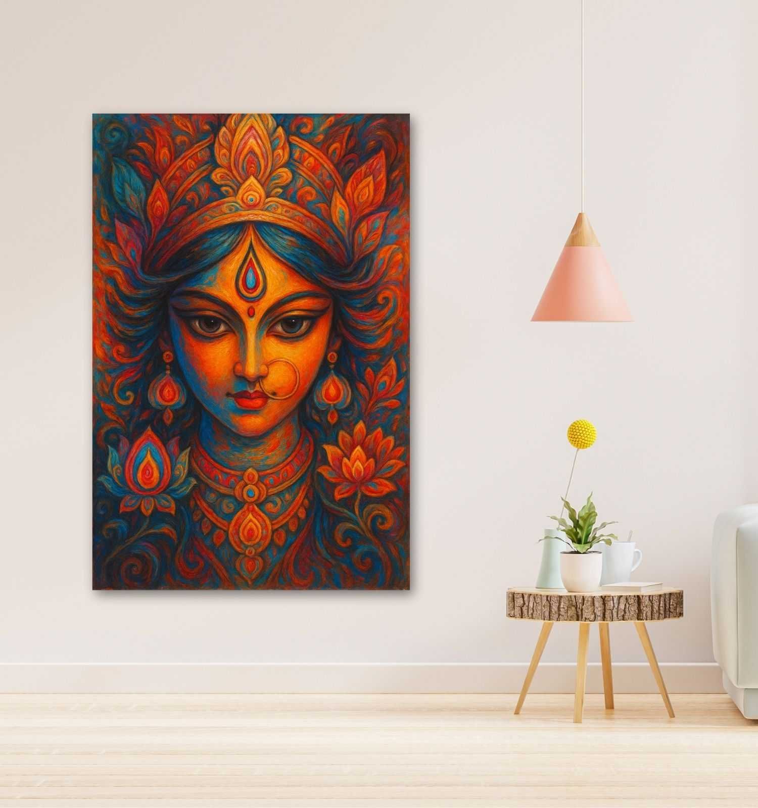 Bring spiritual elegance to your space with this Durga Canvas Painting from KunjCart. Featuring an intricately detailed and vibrant portrayal of Maa Durga, this artwork blends deep orange, red, and mystical blue tones in a captivating abstract painting style. The expression of the goddess is divine and powerful, surrounded by elements like lotus motifs, ornamental jewelry, and glowing patterns, all adding to the majestic feel of this artwork. The shining teardrop tilak and her intense gaze reflect divine strength and feminine energy.