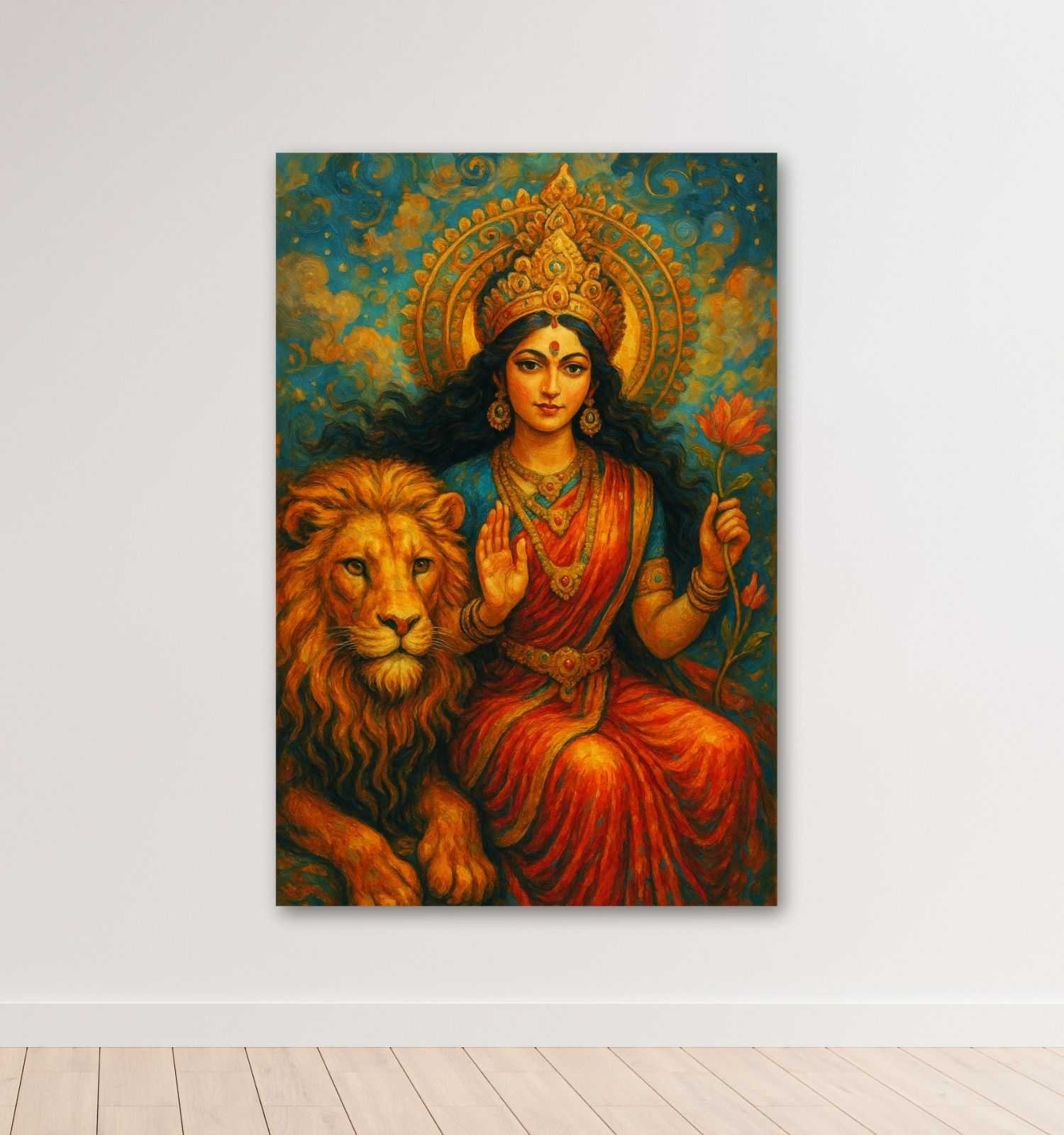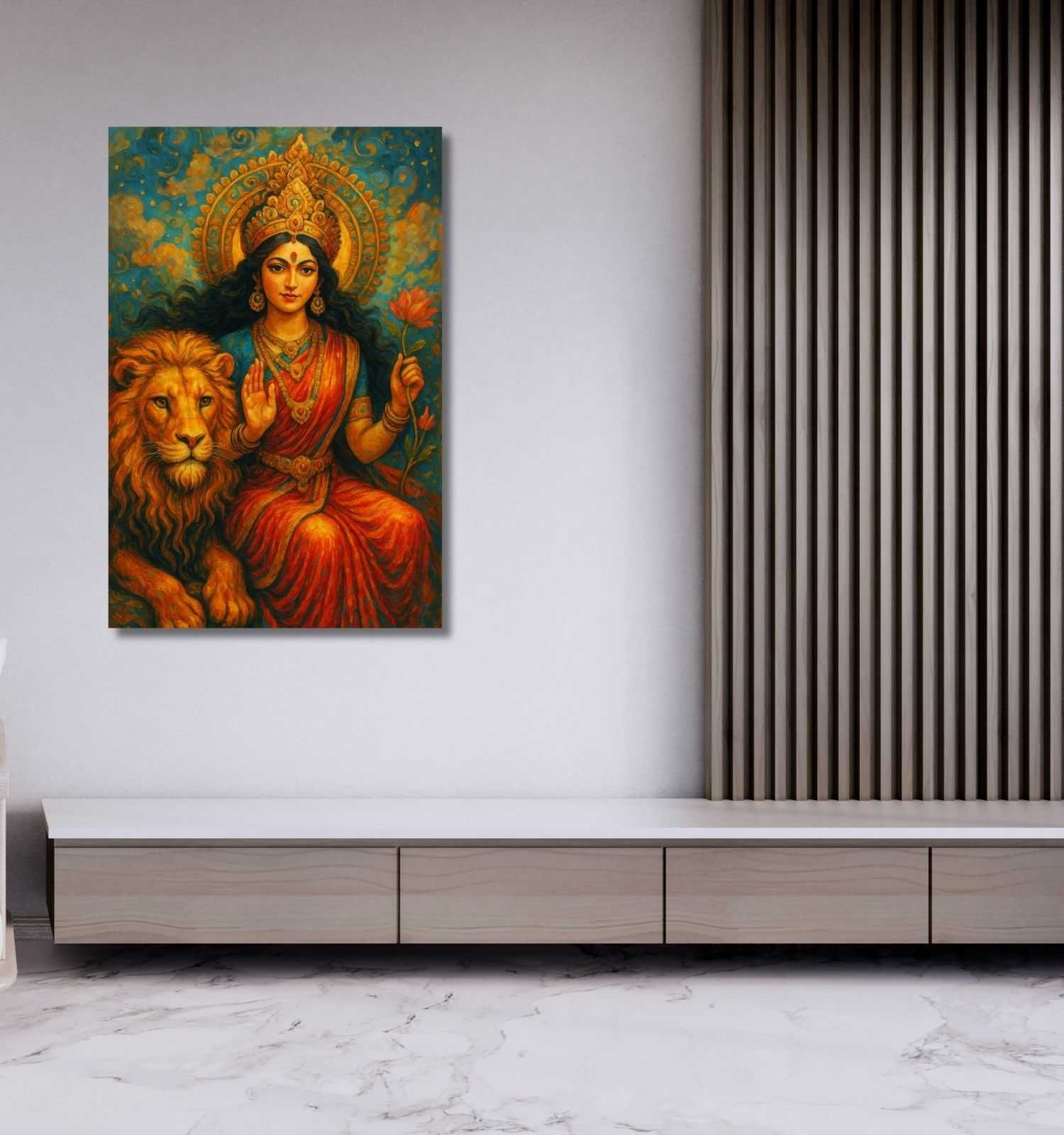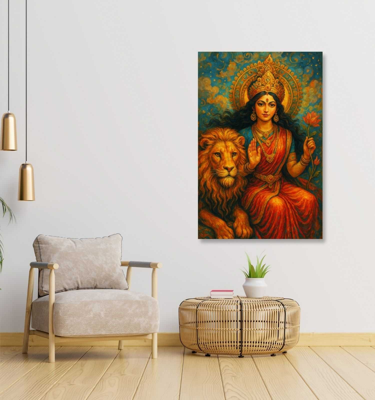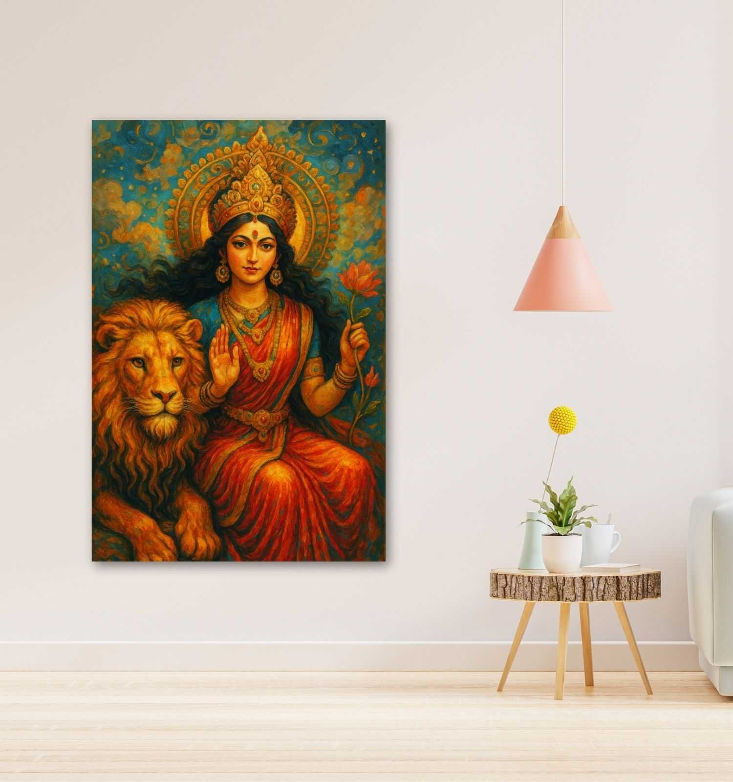 Add divine grace and serenity to your wall with this breathtaking Durga Maa Painting by KunjCart. This artwork showcases Maa Durga seated in a peaceful yet powerful pose, holding a lotus flower and sitting beside a majestic lion, symbolizing fearlessness and purity. Behind her, a richly detailed blue and golden swirling sky creates an ethereal, almost celestial atmosphere that fills your room with positivity.