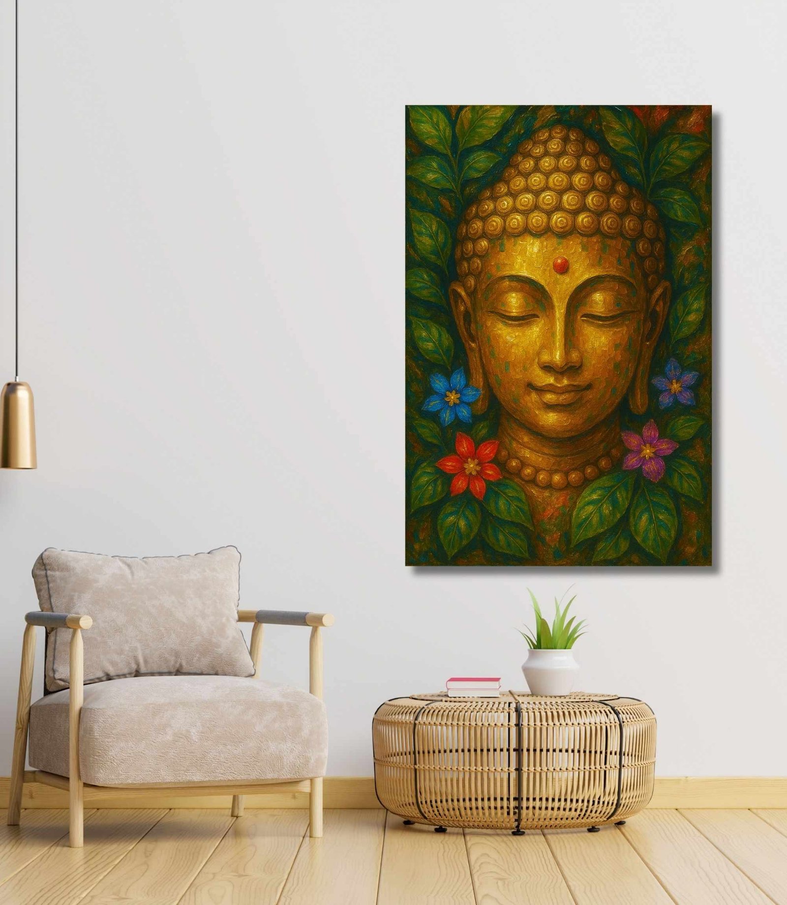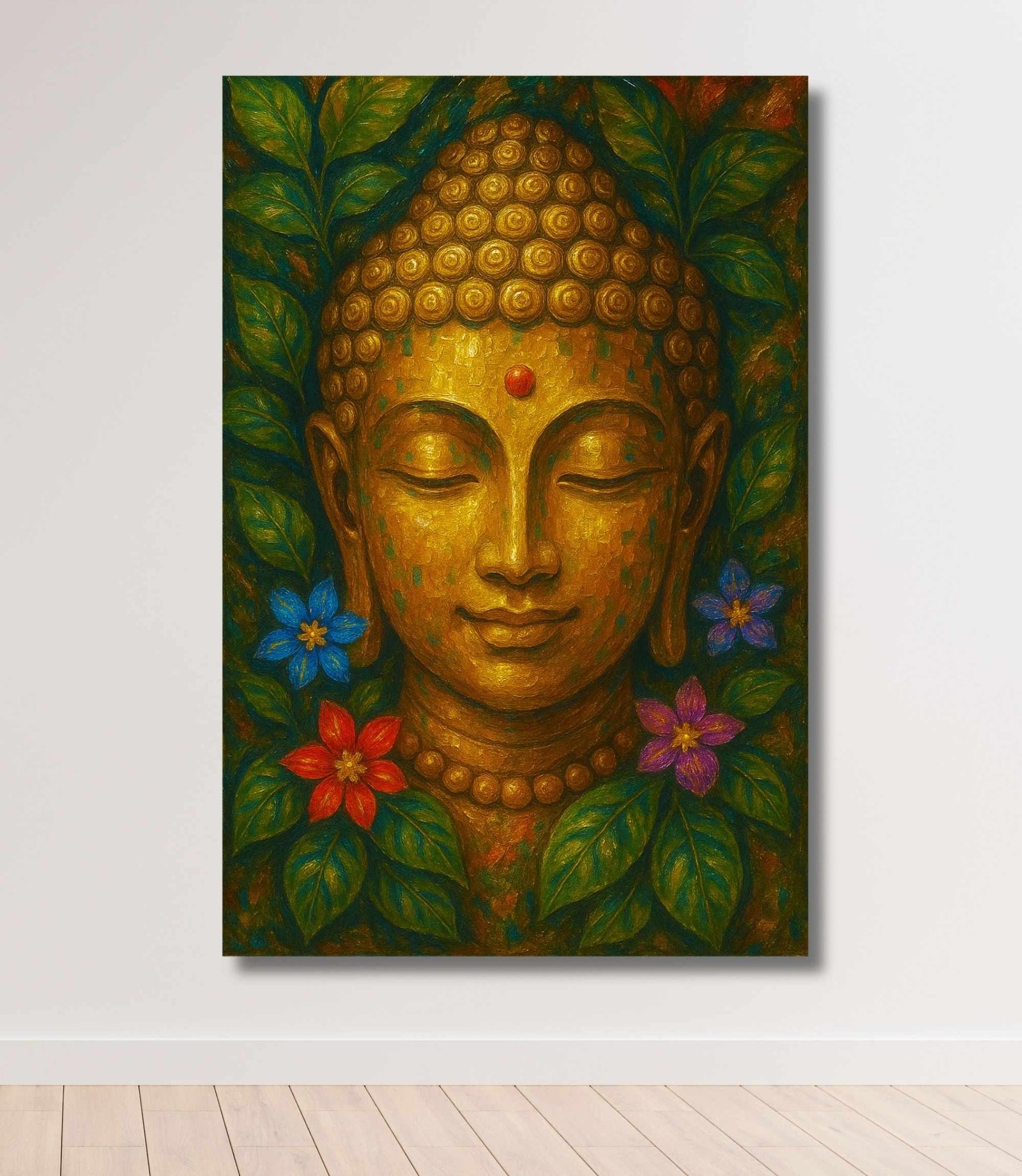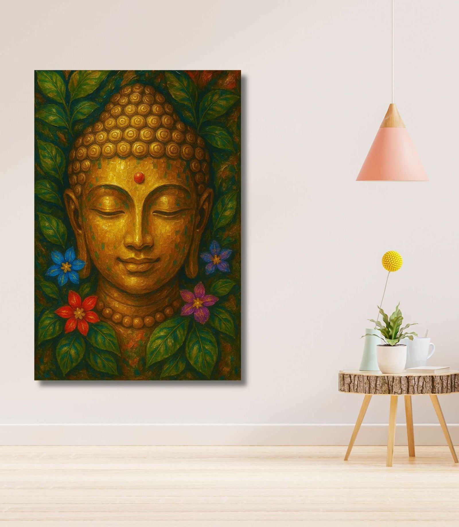 Add harmony and color to your walls with this vibrant Buddha canvas painting by KunjCart. This artwork features a golden meditative face of Lord Gautam Buddha, surrounded by lush green leaves and multicolored flowers in hues of red, blue, and purple. The detailed brushwork creates a soft glowing effect on the face and enhances the calmness in Buddha’s expression, delivering both elegance and spiritual energy to your space. The warm tones, rich textures, and peaceful composition make it a standout piece for any wall.