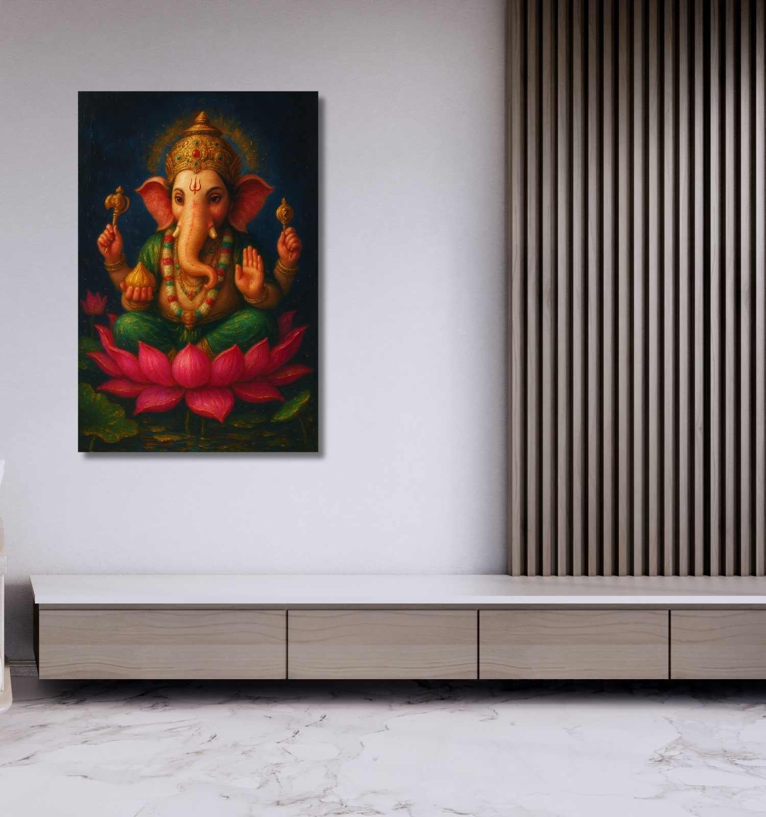 This ganpati canvas painting makes a perfect gift for housewarming, festive occasions, or spiritual celebrations. It suits every interior from modern apartments to traditional homes offering both peace and aesthetic beauty.