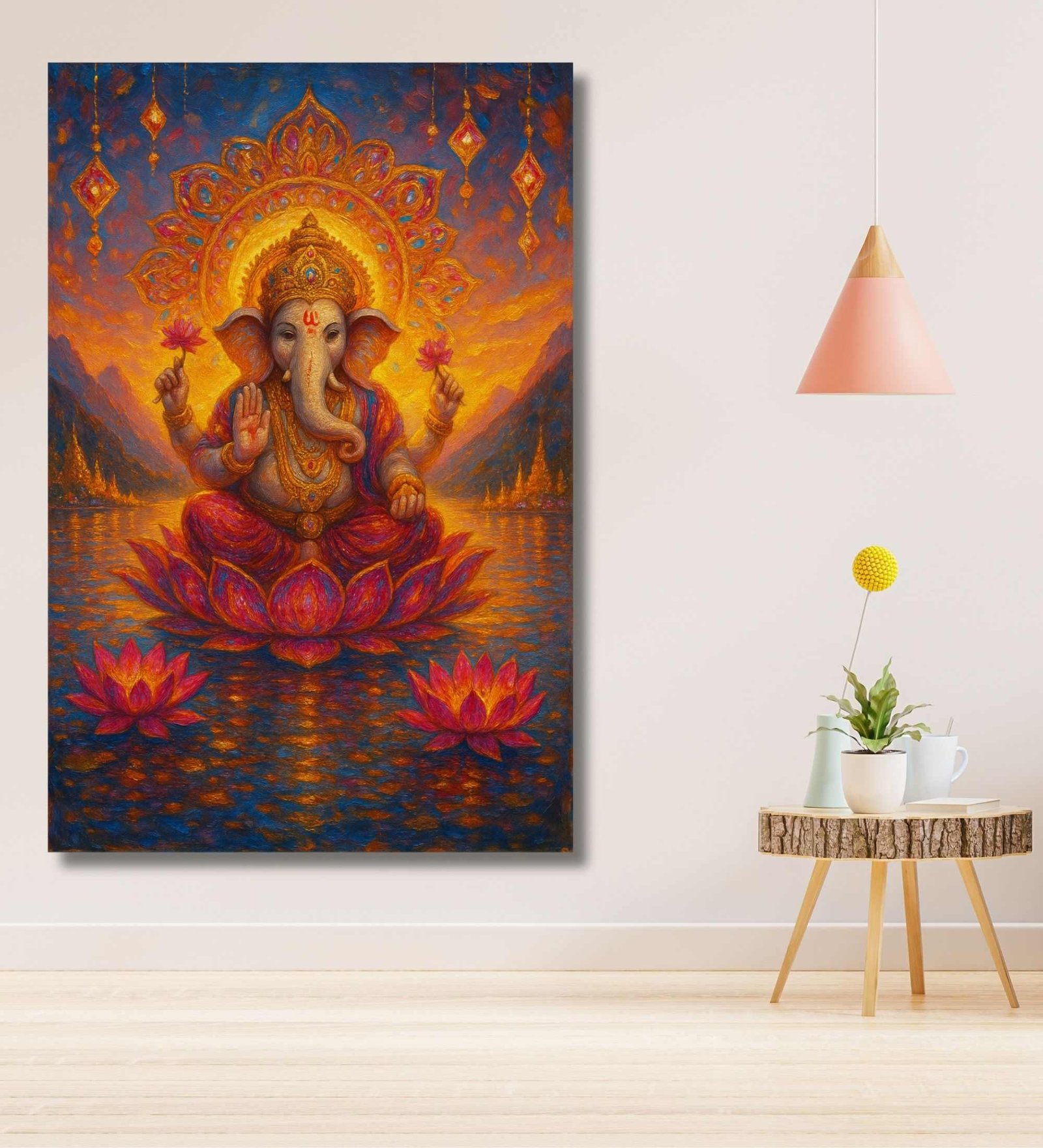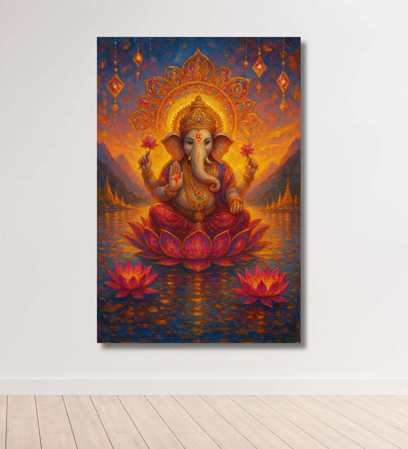 Add divine energy to your interiors with this vibrant Ganesha painting for wall decoration by KunjCart. The painting features Lord Ganesha seated gracefully on a blooming lotus amidst a serene water body, set against a radiant sunset-inspired background with glowing orange, golden, and blue hues.