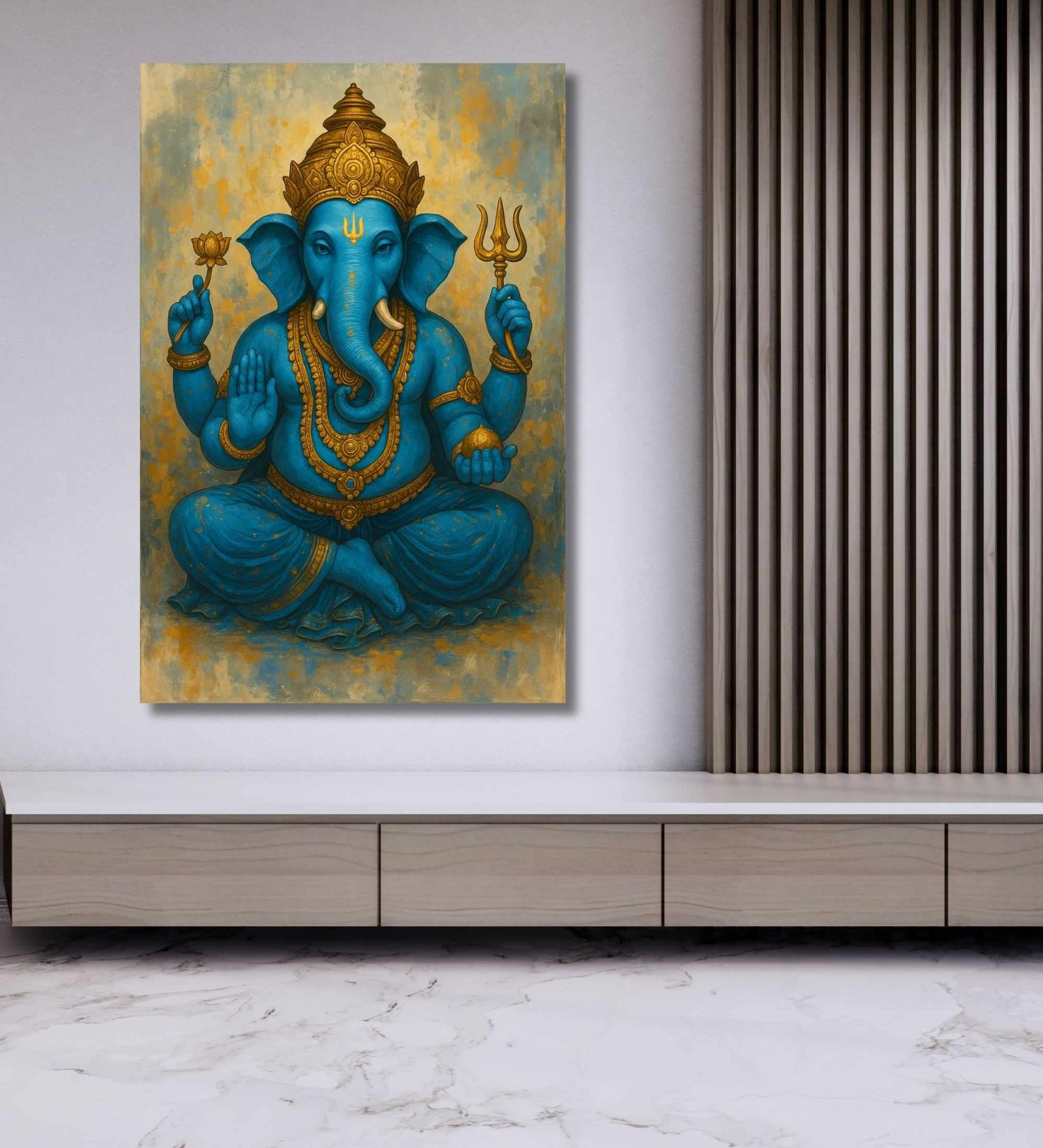 Elevate your spiritual décor with this striking Ganpati canvas painting by KunjCart, featuring a bold and majestic portrayal of Lord Ganesha in vibrant blue tones, adorned with intricate golden jewelry and crown. The artwork captures Ganesha holding a lotus, modak, and trident, seated gracefully in a meditative posture against a textured golden-beige background.