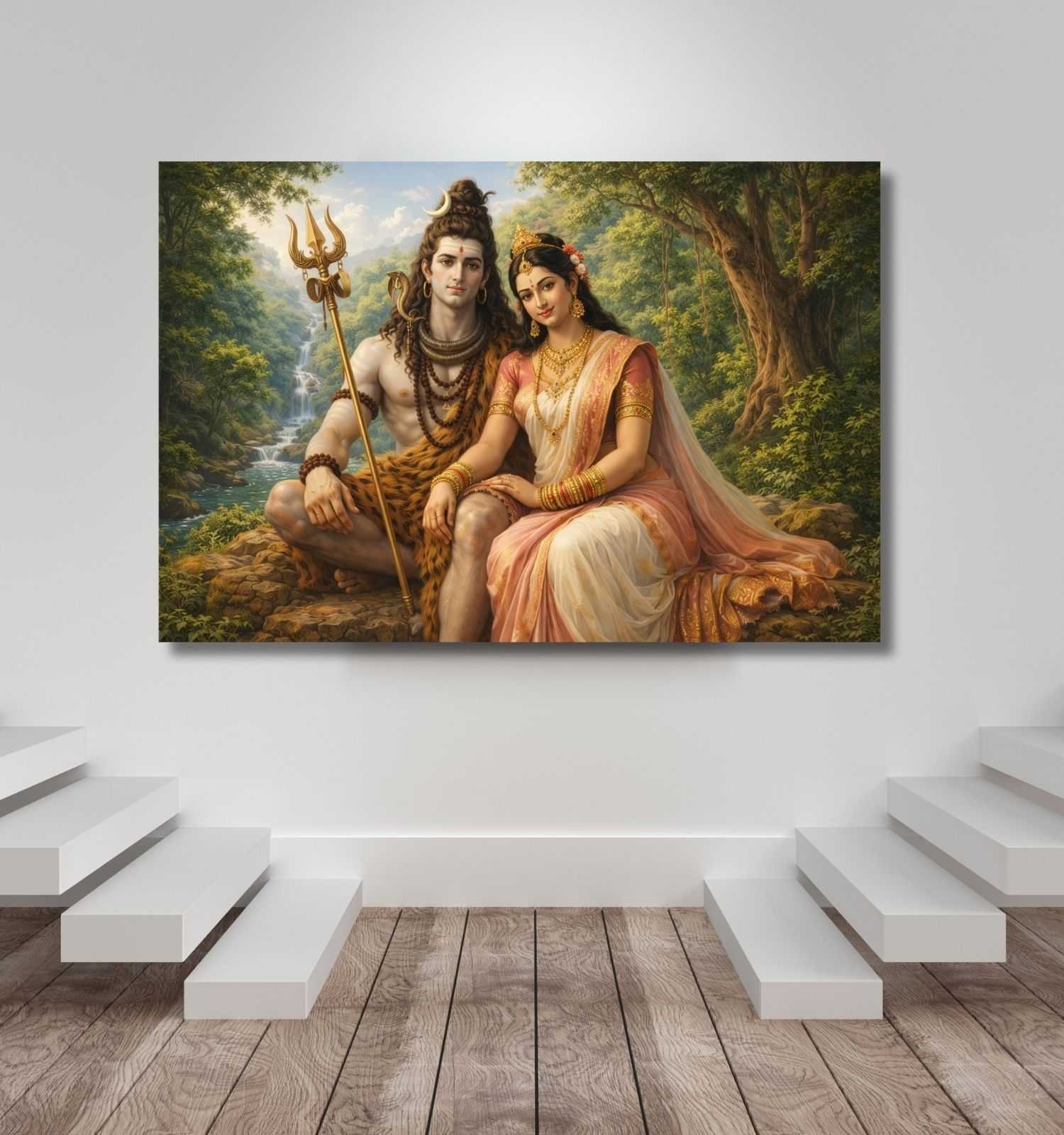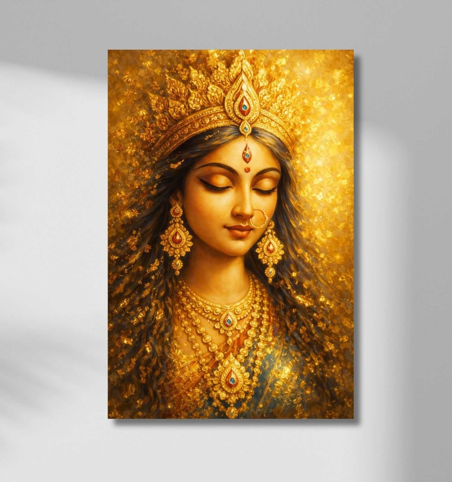 KunjCart presents a divine Gayatri Mata painting featuring golden aura, red saree, lotus seat and swan in a serene water setting. This HD artwork has rich colors, shining tones and detailed elements that give a peaceful spiritual vibe. Made on 380 GSM high quality canvas, it looks like an original handmade painting, not a printed wallpaper. Colors are long lasting, waterproof and perfect for indoor decor. Available in framed and unframed options with multiple sizes and custom size support. KunjCart ensures premium quality, making it a perfect vastu-inspired wall art and meaningful gift for home or office decoration.