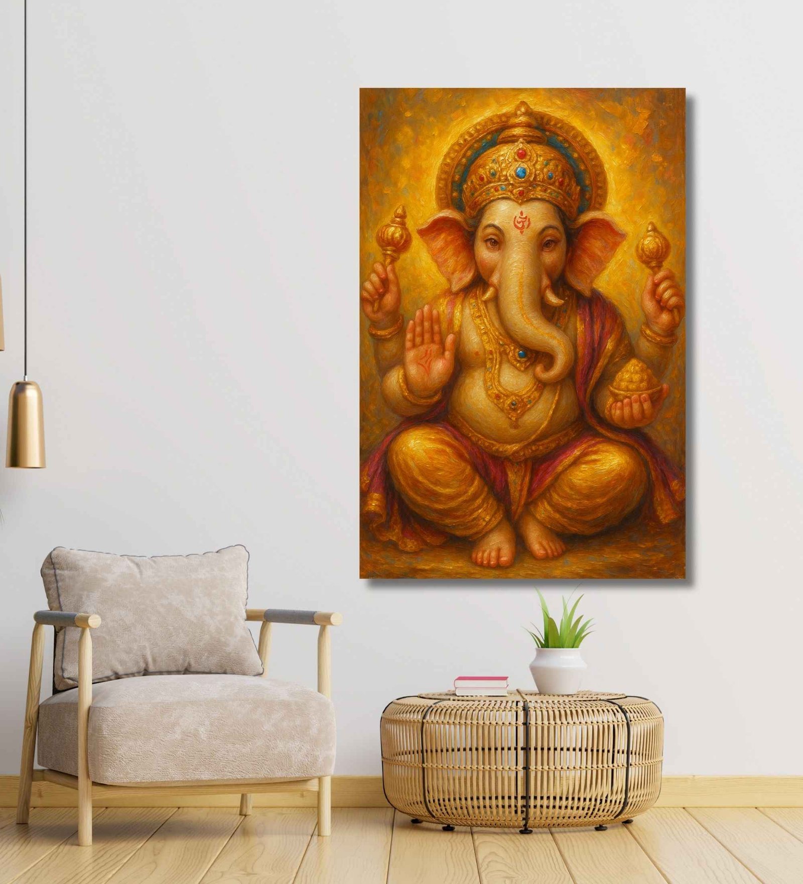 Illuminate your space with this majestic ganesha painting for wall decoration from KunjCart. This artwork features Lord Ganesha sitting in a divine posture, holding a modak and a golden mace, with a raised hand offering blessings. The painting shines with regal gold tones, enhanced by rich accents of ruby, sapphire, and warm orange hues creating an abstract ganesha painting that looks entirely hand-painted. This lord ganesha wall painting from KunjCart brings luxury, divinity, and artistic elegance together in one timeless piece.
