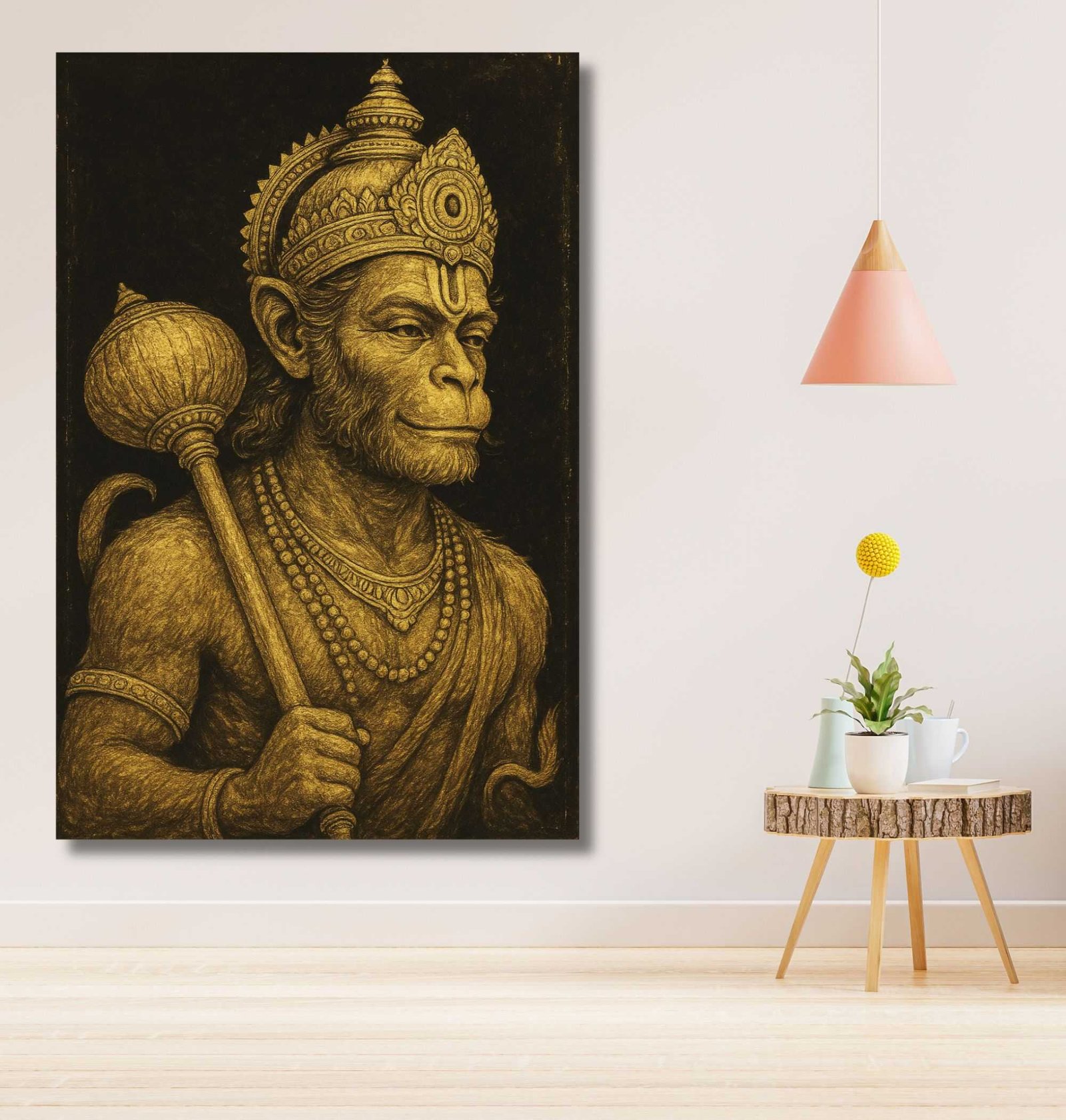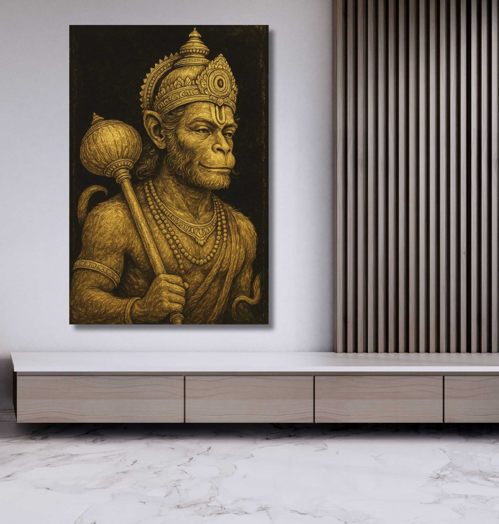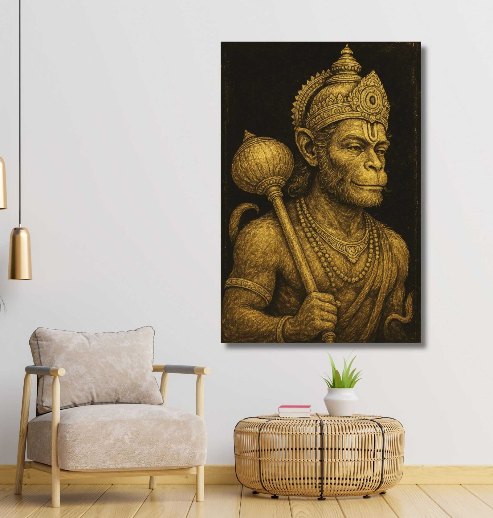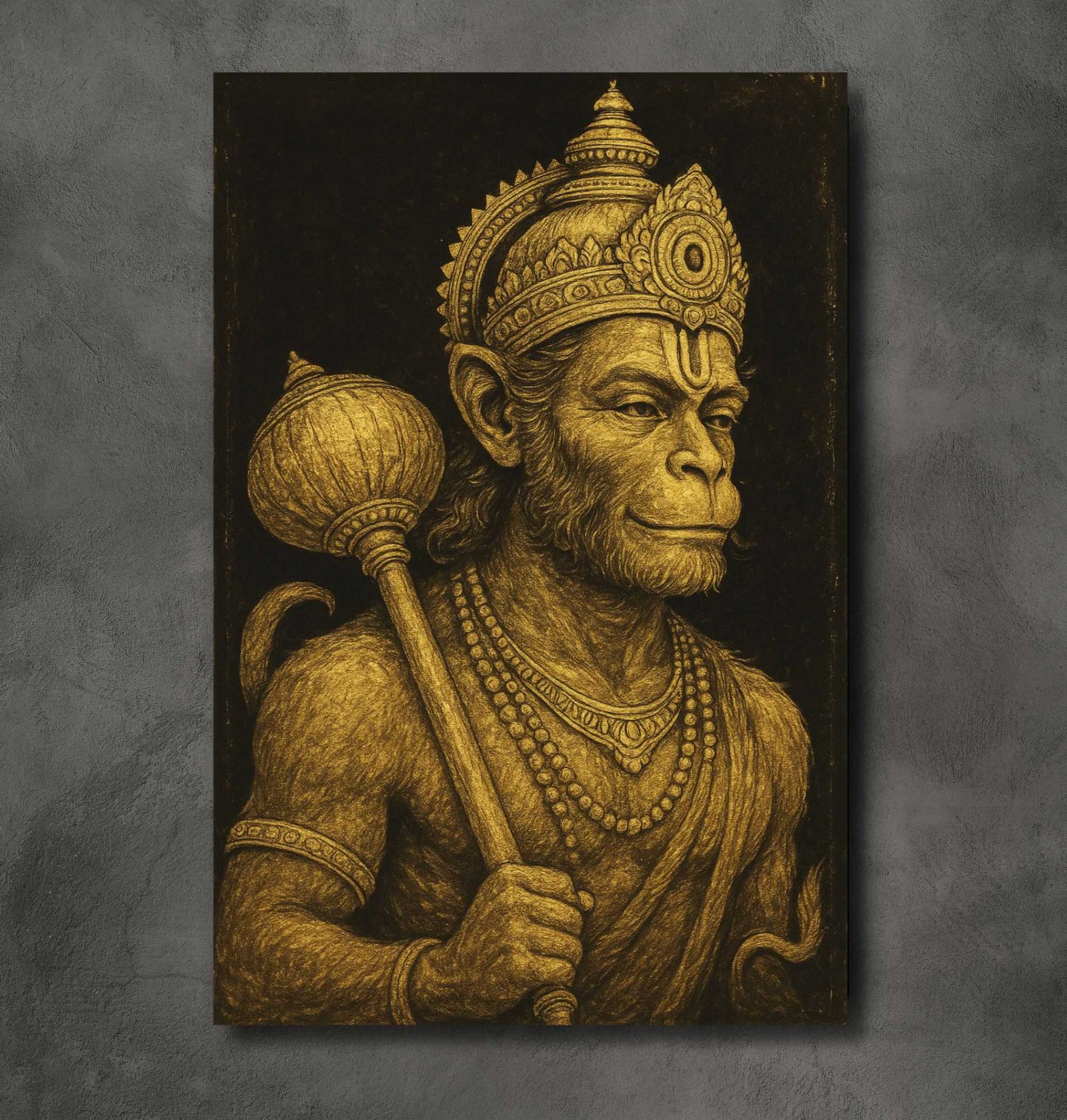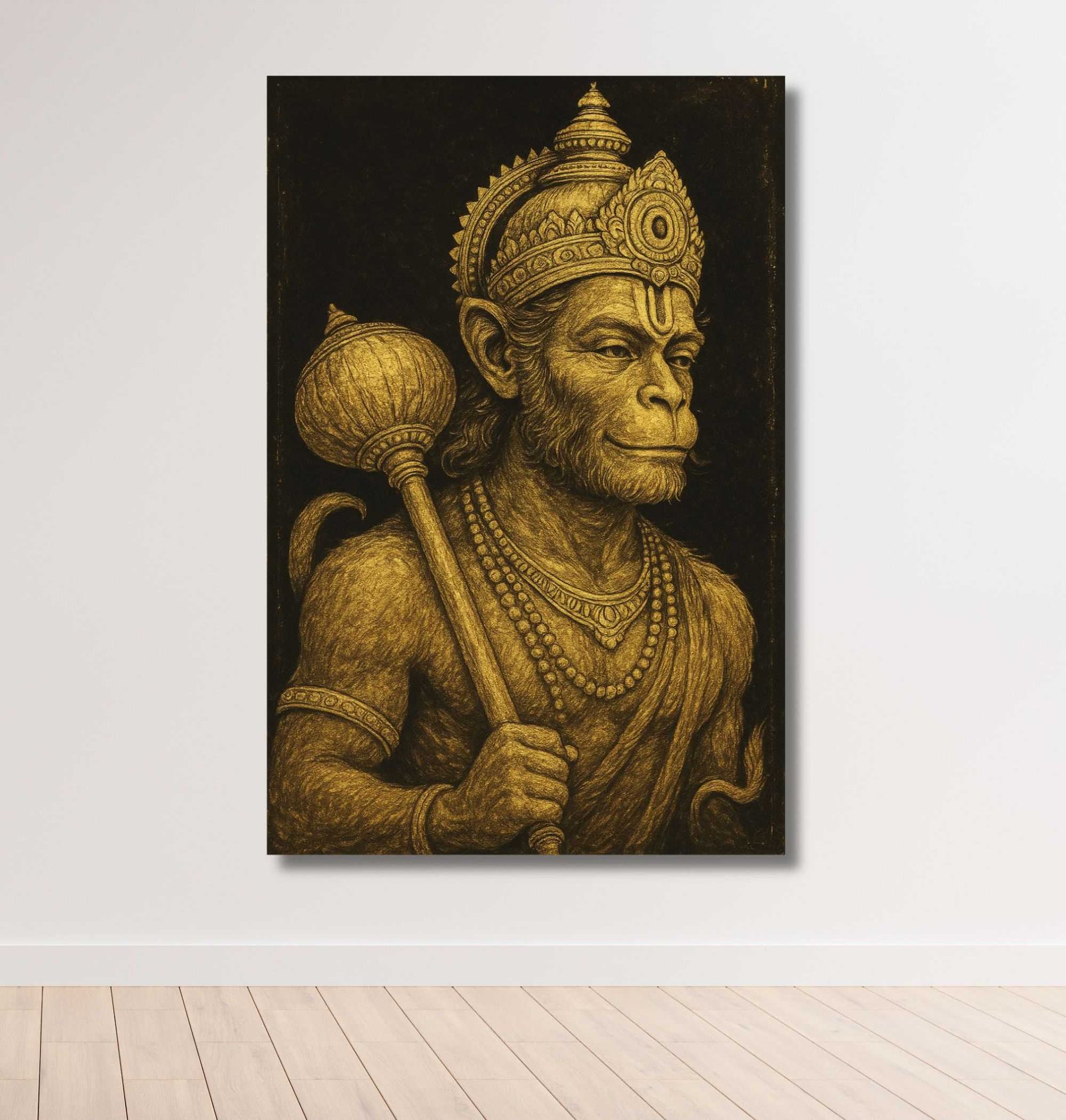 Bring home power, divinity, and devotion with this majestic Hanuman Painting For Wall from KunjCart. This striking artwork features Lord Hanuman illustrated in a regal sketch-style using golden tones on a bold black background, creating a rich, royal appearance that stands out in any space. Hanuman Ji holds his traditional Gada (mace) in one hand, and his determined, confident expression symbolizes strength, loyalty, and calm.