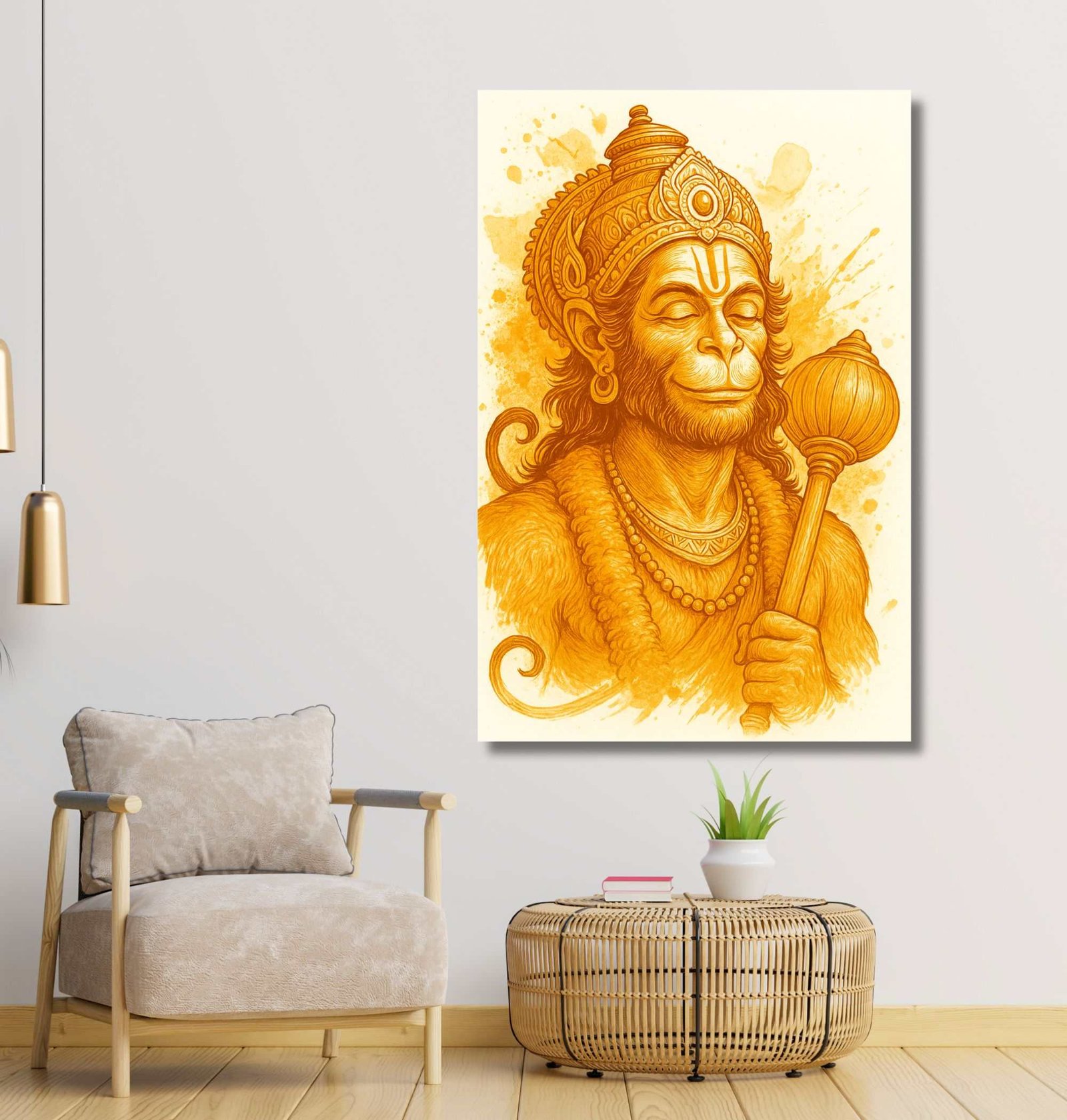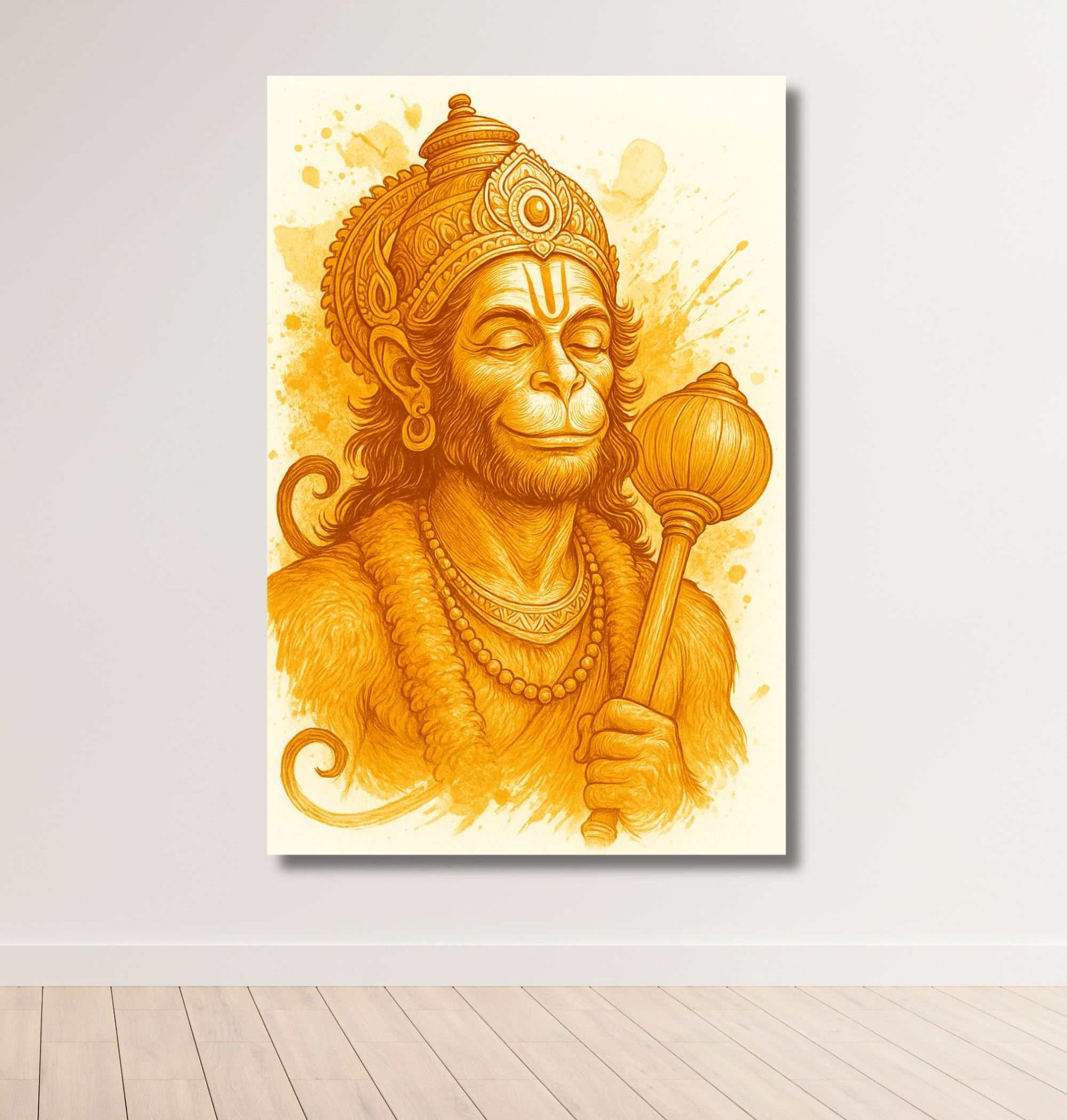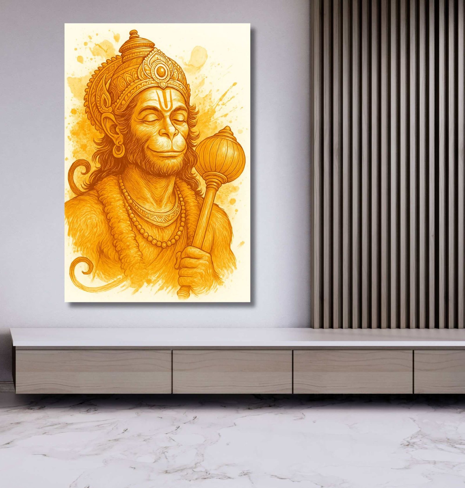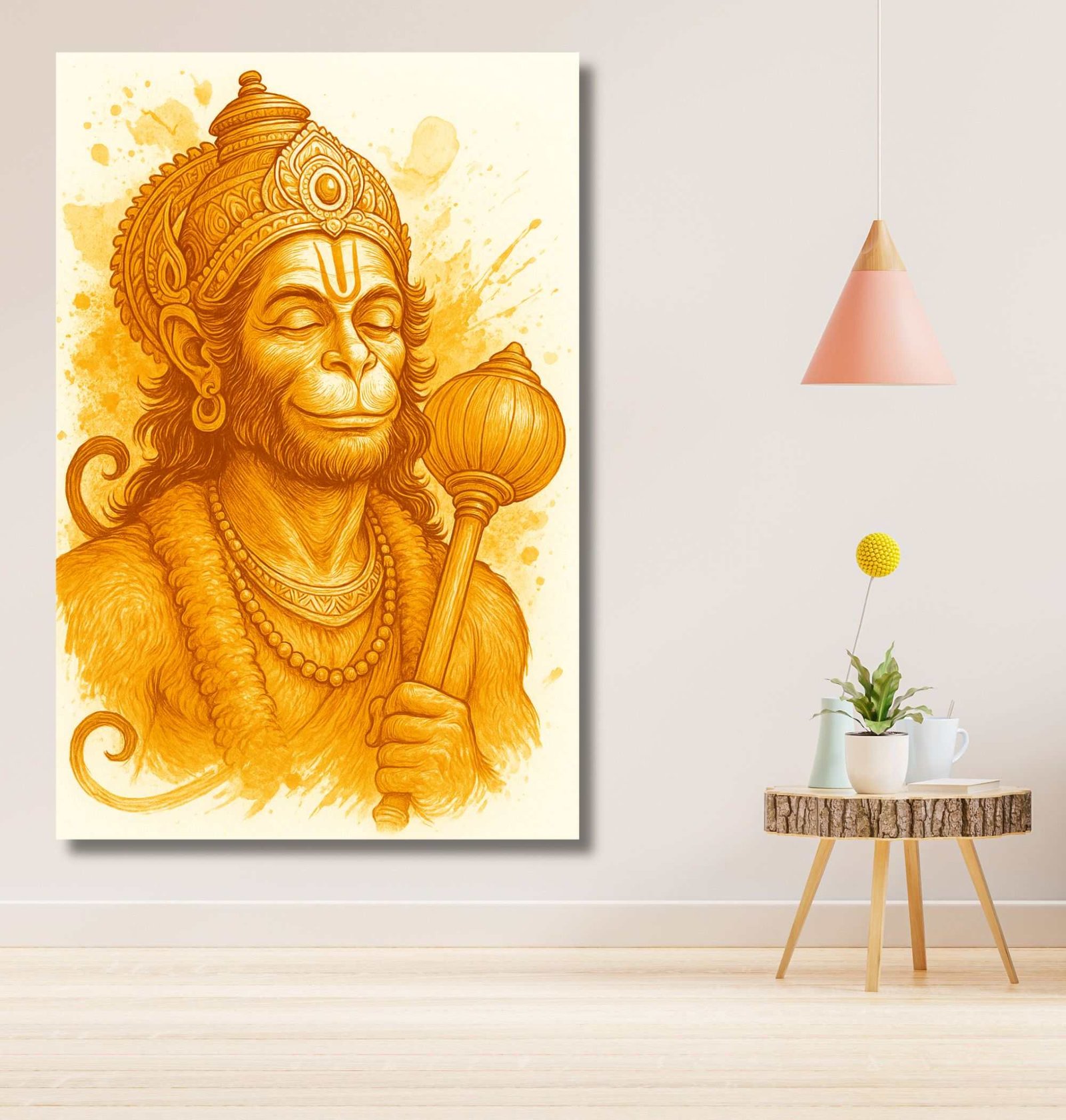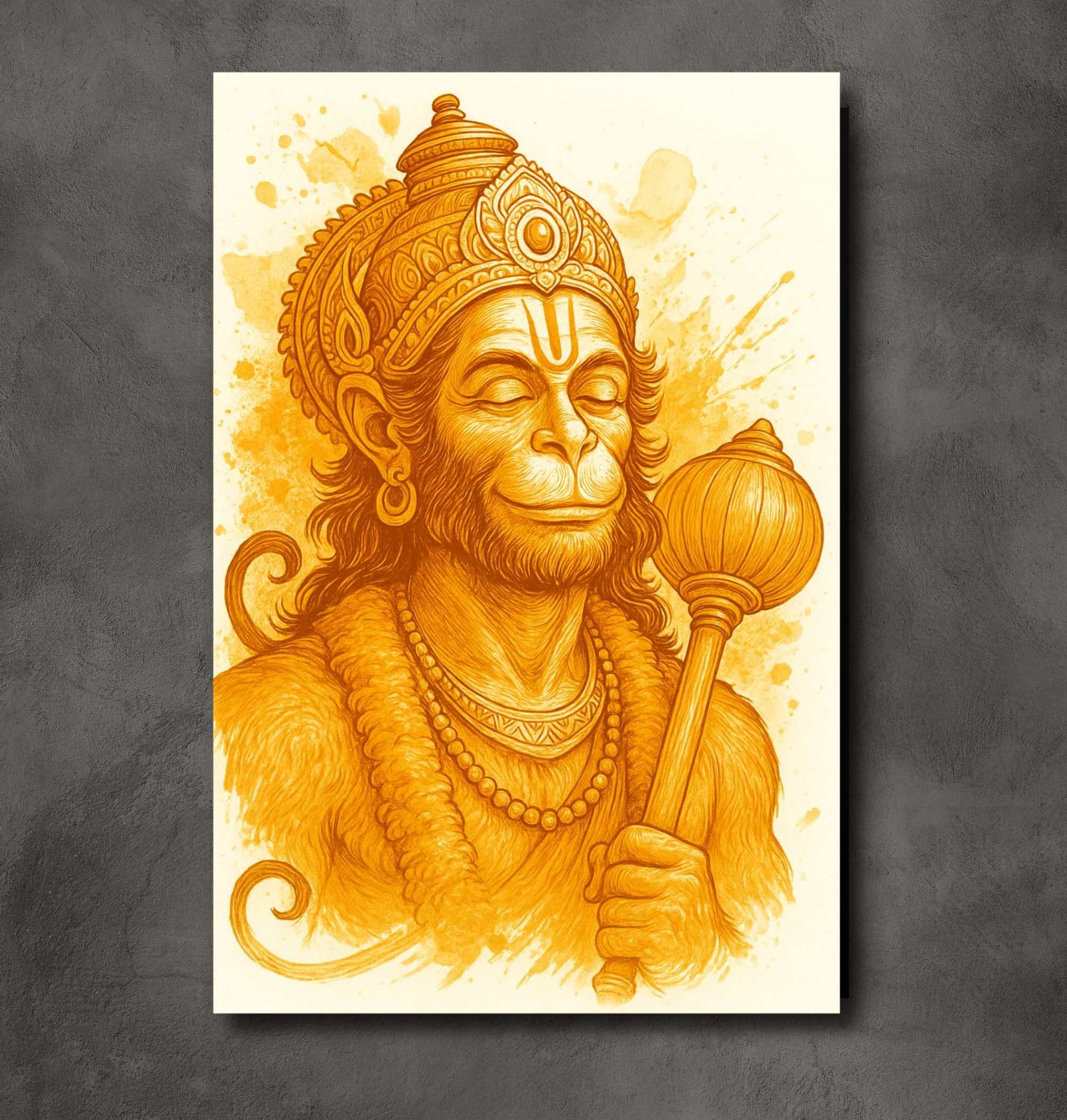 Embrace serenity and divine grace with this beautiful Hanuman Painting For Wall from KunjCart. This artwork features Lord Hanuman with a calm and content expression, holding his sacred Gada, captured in a detailed golden-yellow watercolor style. His peaceful smile, closed eyes, and traditional ornaments radiate devotion, strength, and spiritual stillness.