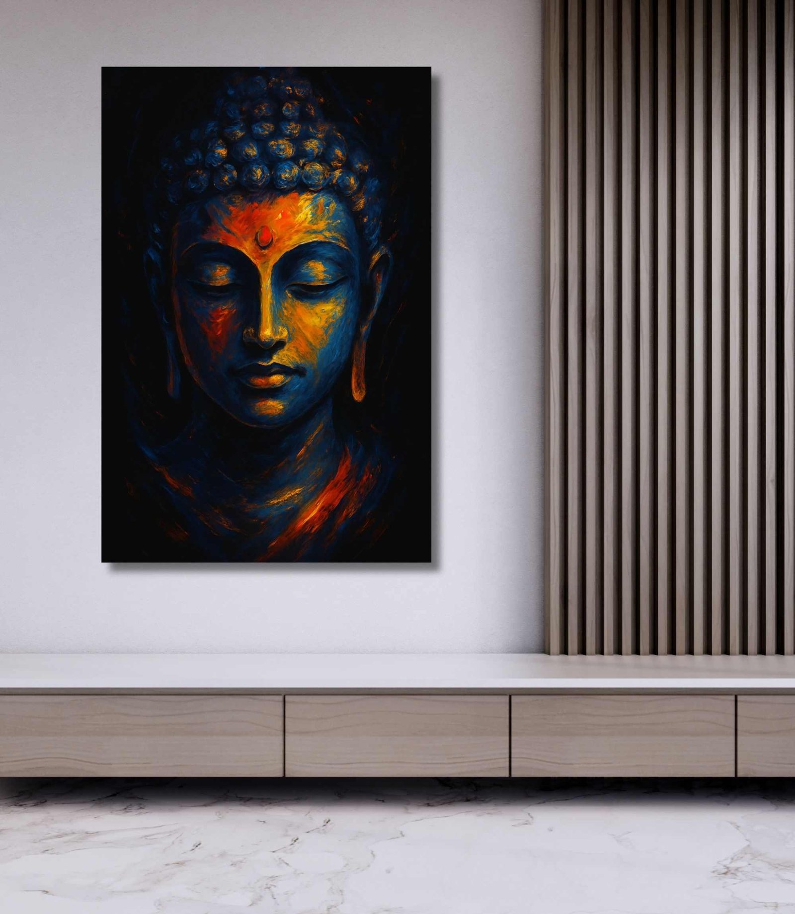 Bring peace, depth, and modern artistry to your space with this stunning Buddha canvas painting by KunjCart. This high-definition artwork features Lord Gautam Buddha in a calm meditative expression, painted in deep blue and fiery orange tones that create a dramatic spiritual ambiance. The glowing forehead and textured curls reflect light beautifully, adding a sense of serenity and elegance. With a luxury handmade painting touch, this masterpiece is far from a generic wallpaper—each brushstroke feels alive, mimicking authentic oil painting techniques.