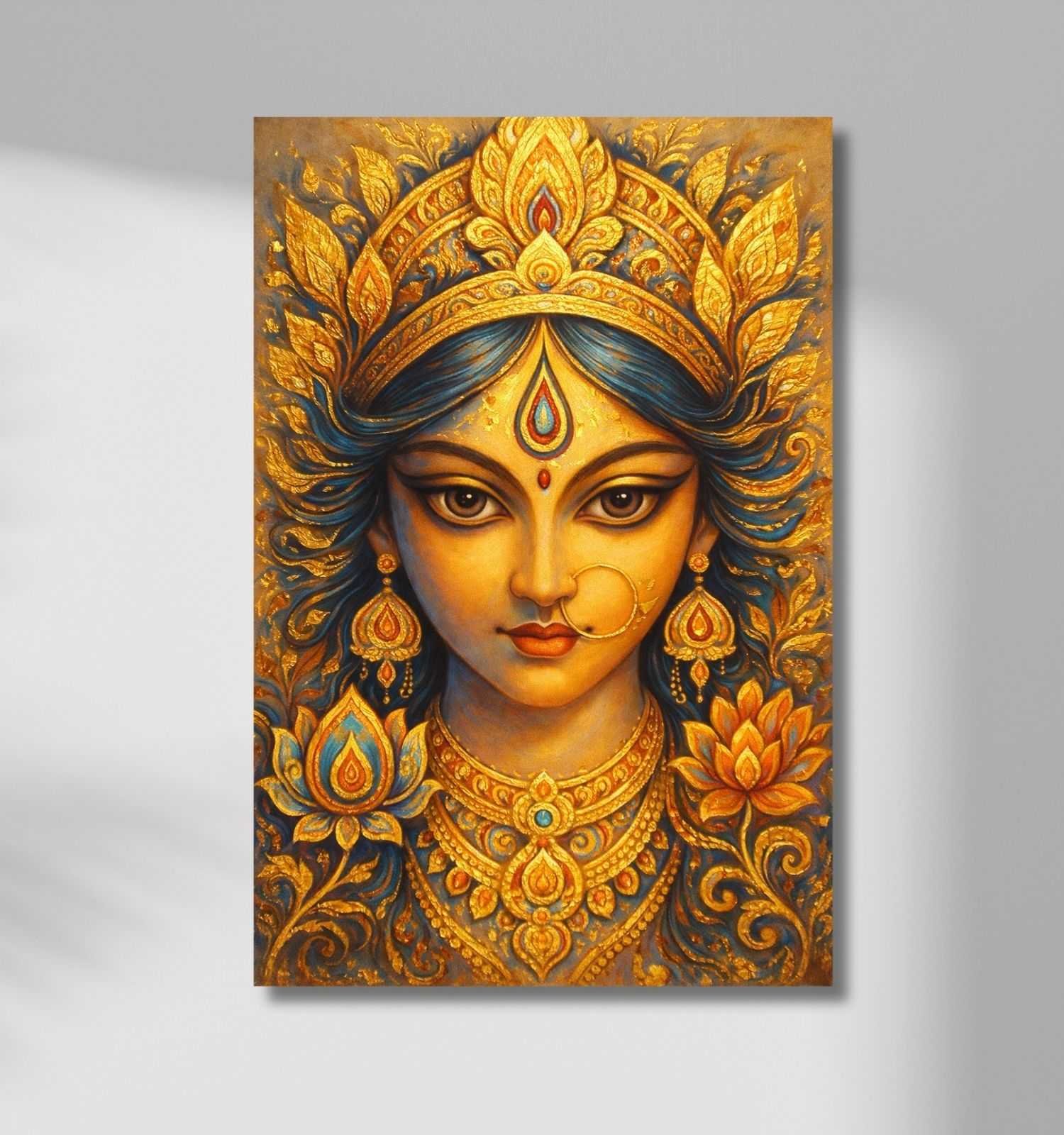 Bring spiritual beauty to your home with this kamdhenu cow painting vastu artwork by KunjCart. The painting shows a graceful white Kamdhenu cow walking with her calf, decorated with golden ornaments and sacred hand symbols. Behind them, blooming pink lotus flowers stand against a warm golden background, creating a shining and peaceful atmosphere. Printed on 380 GSM premium canvas, it looks like a real handmade painting rather than wallpaper. HD printing with high-quality ink ensures bright, waterproof and long-lasting colors. Available in framed and unframed options with multiple sizes and custom size choices. KunjCart presents this vastu inspired wall art as a beautiful décor piece and meaningful gift.