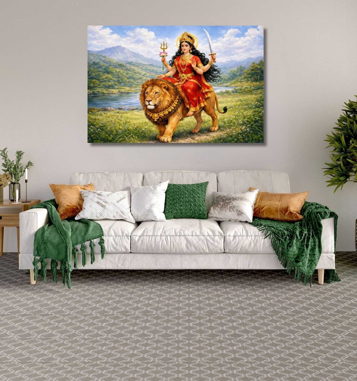 Bring divine charm to your walls with this kamdhenu cow painting vastu artwork by KunjCart. The painting shows a graceful white Kamdhenu cow with her calf standing peacefully under a decorative temple arch, surrounded by blooming pink lotus flowers and soft green leaves. The light golden background and sacred hand symbols create a calm and spiritual feeling for any space. Printed on 380 GSM premium canvas, this artwork has a handmade painting look instead of wallpaper. HD printing with high-quality ink provides bright, waterproof and long-lasting colors. Available in framed or unframed options with multiple sizes. KunjCart offers this vastu inspired painting as an elegant décor and gift.
