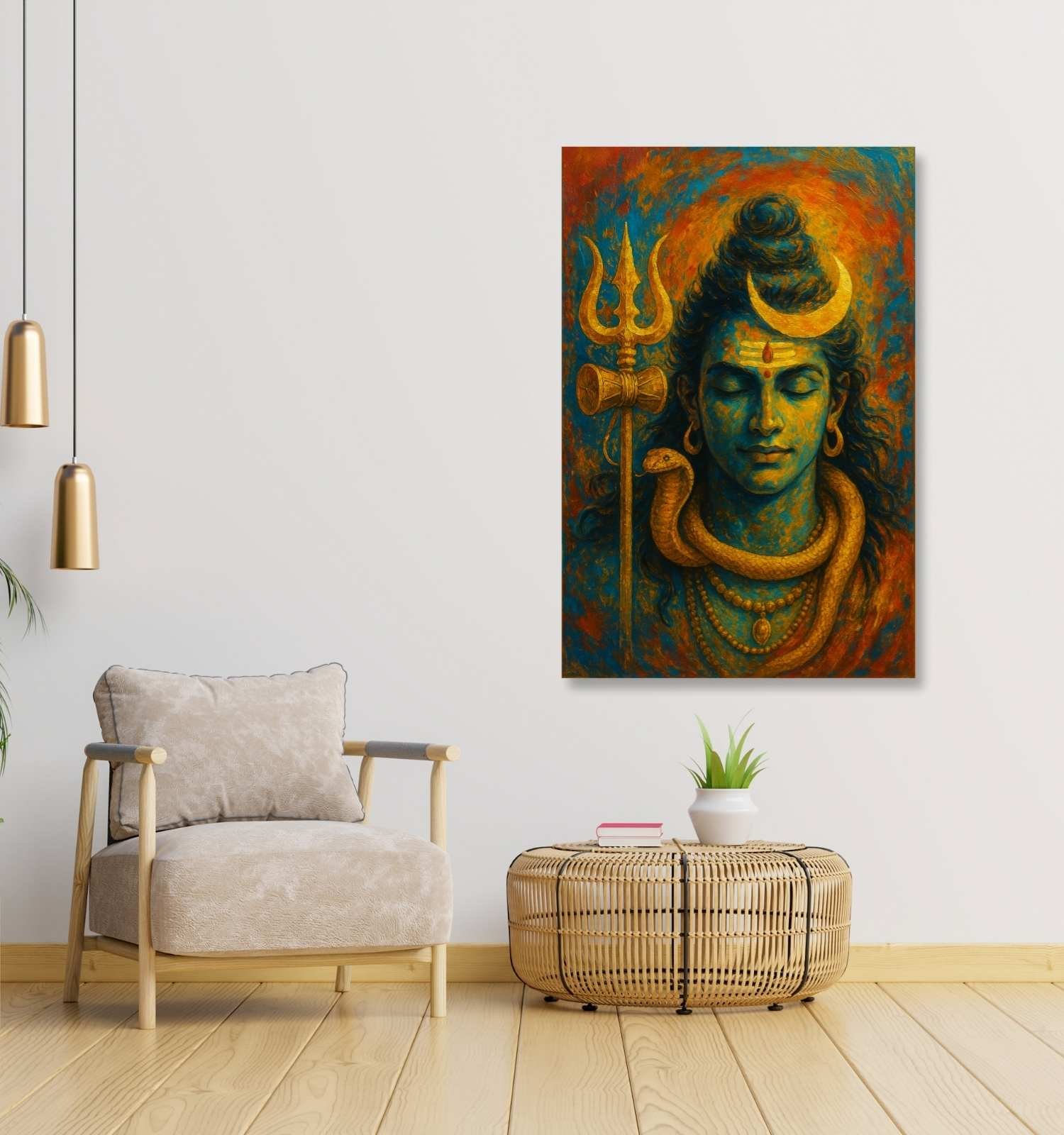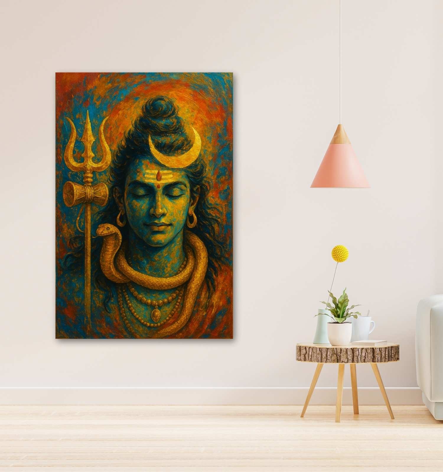 Spiritual Symbolism in Every Element: From the crescent moon to the detailed snake and Trishul, this painting is filled with powerful symbols that enhance spiritual energy and focus in any room it’s placed.