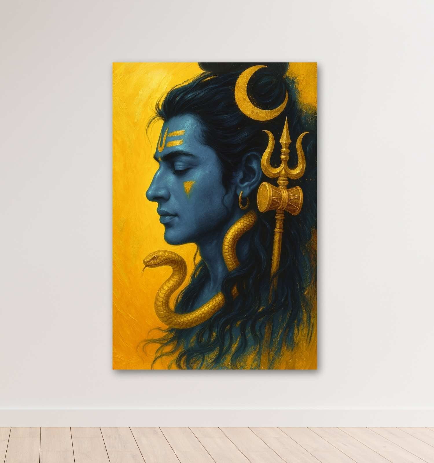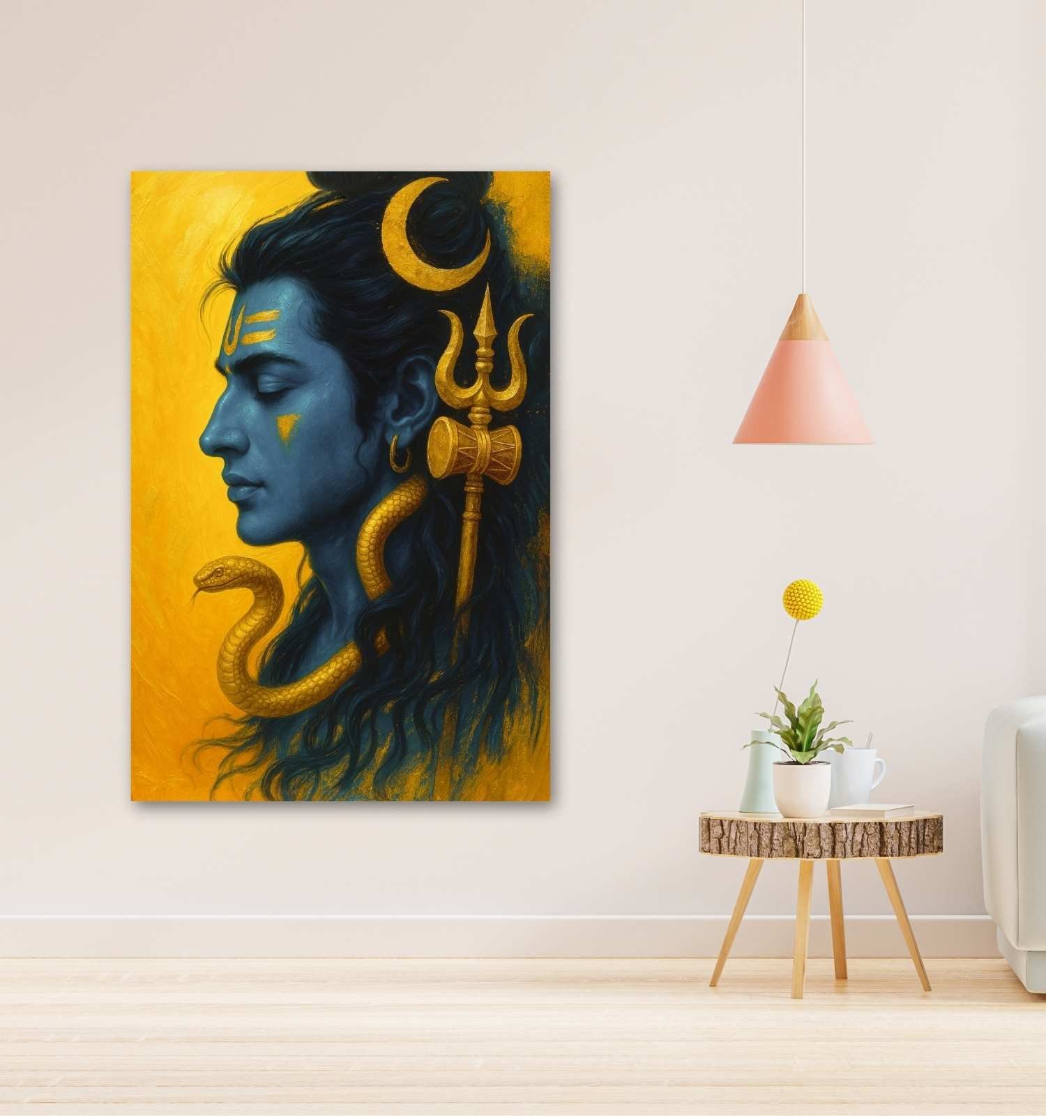 1. Modern Spiritual Artwork – This Lord Shiva painting features a side-profile of Mahadev in calming blue tones, paired with golden highlights like a crescent moon and trishul, giving it an abstract, contemporary devotional look.