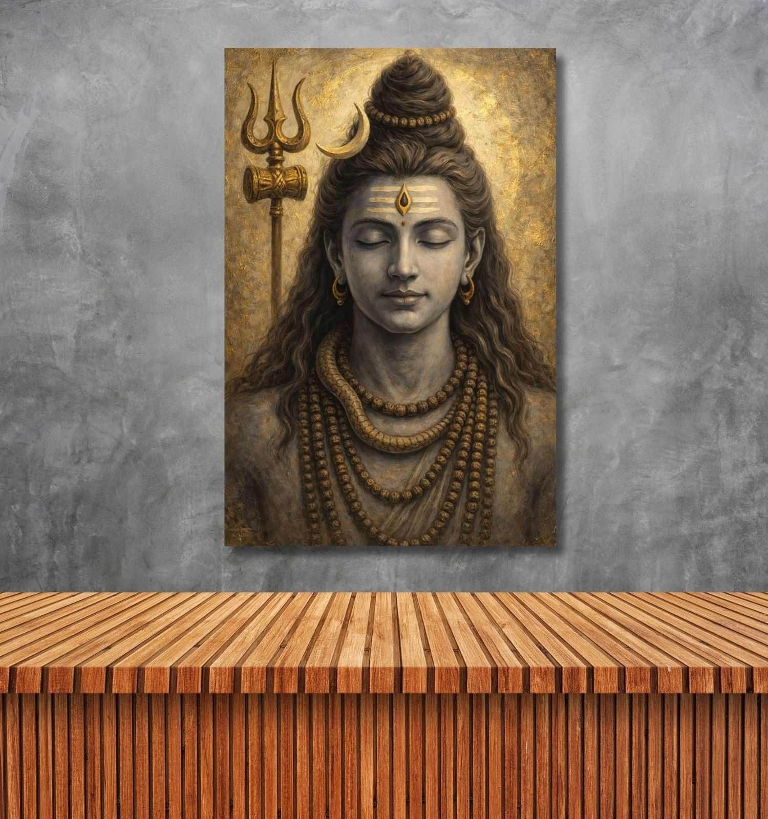 Experience divine serenity and spiritual power with this Lord Shiva Painting by KunjCart. This beautiful artwork captures Lord Shiva in a peaceful meditative state, with a golden crescent moon on his hair, Trishul and Damaru by his side, and a coiled snake around his neck. The blue skin tone symbolizes calm energy while the deep saffron background radiates divine strength and warmth.