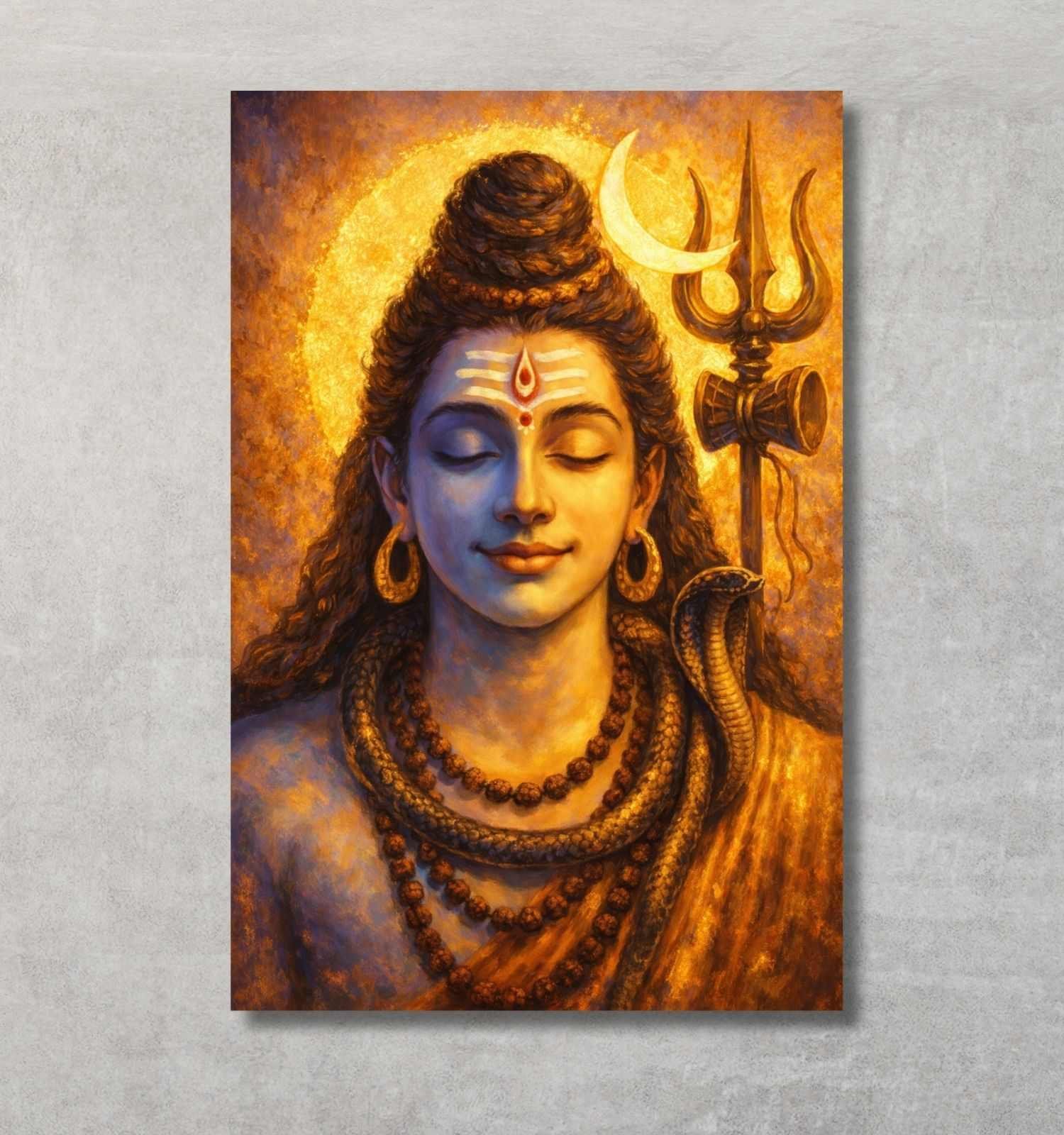 Add vibrant divinity to your space with this Lord Shiva wall painting by KunjCart, featuring a captivating blend of fiery orange and deep blue tones. Lord Shiva is shown in serene meditation with iconic details like the crescent moon, Trishul, coiled snake, and Rudraksha mala, symbolizing power and peace.