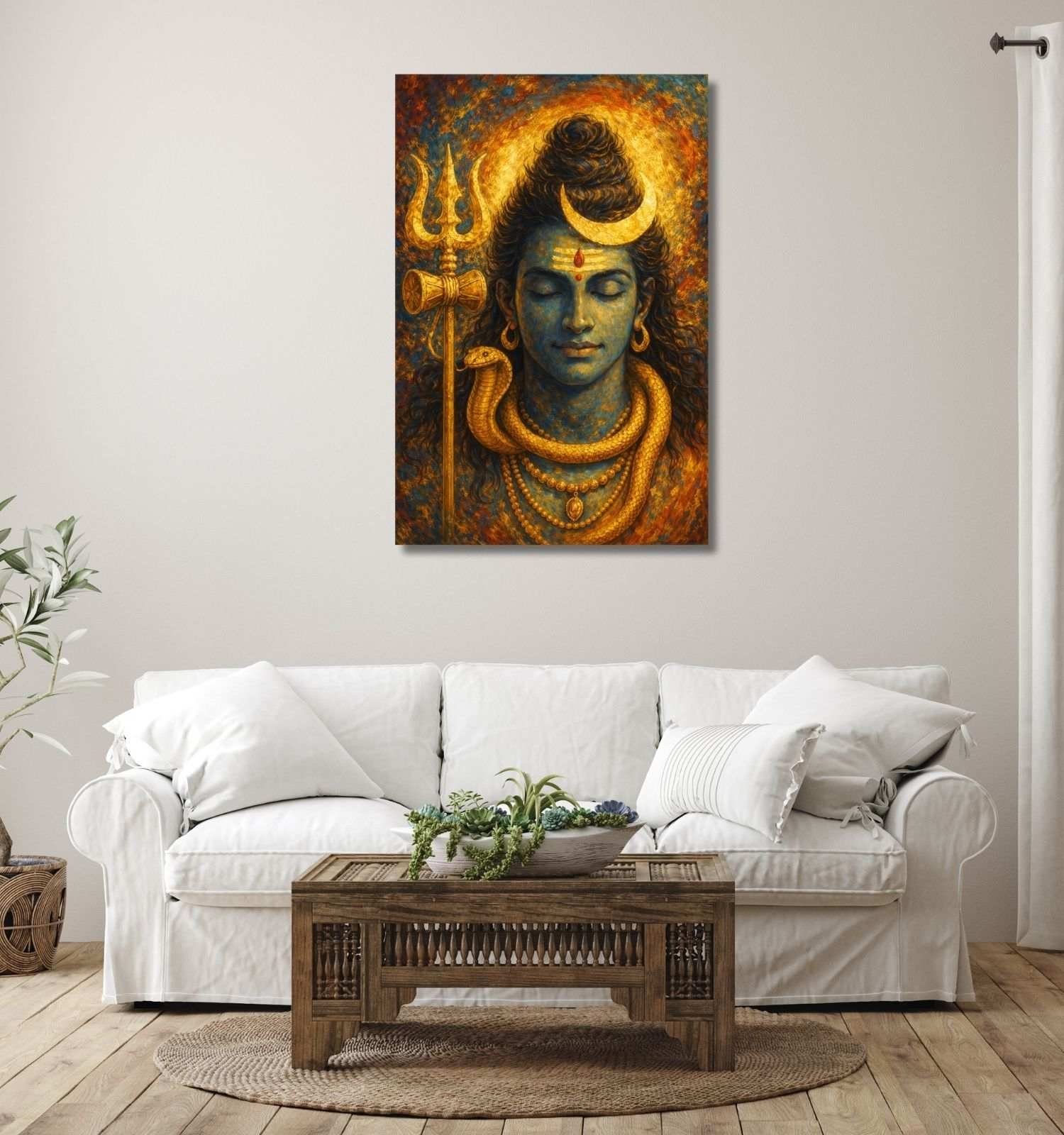 KunjCart presents a divine and powerful Lord Shiva wall painting, masterfully designed on premium 380 GSM canvas that delivers long-lasting durability and elegance. This artwork showcases Lord Shiva in deep meditation, with his iconic Trishul, Rudraksha mala, snake, and crescent moon, painted in vibrant blue and saffron-orange tones that represent peace, strength, and spiritual energy.