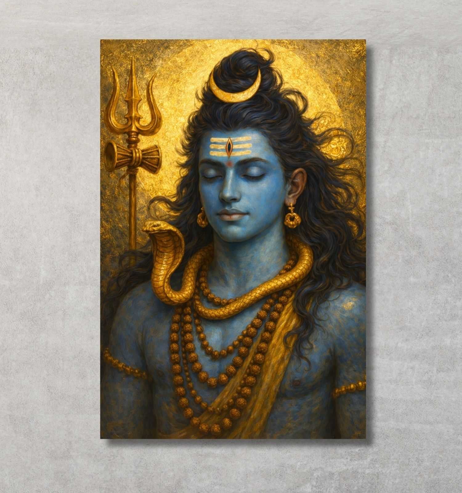 Bring the divine presence of Mahadev into your space with this serene and powerful mahadev wall painting, exclusively crafted by KunjCart. This artwork captures Lord Shiva in a calm meditative expression, with beautifully detailed elements including a radiant crescent moon, golden trishul, and a symbolic cobra wrapped around the neck. The deep blue tones of Shiva’s skin contrast magnificently with the golden and orange halo, creating a glowing spiritual aura.