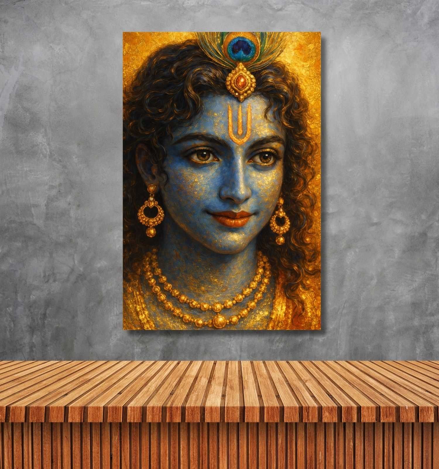 Introducing an elegant and spiritual Modern Art Krishna Painting by KunjCart, featuring a divine close-up portrait of Lord Krishna with abstract brush textures. This beautiful artwork highlights Krishna’s blue-toned glowing skin, adorned with golden jewelry, a rich orange-red background, and a vibrant peacock feather gracefully placed in the crown. The expression is calm, thoughtful, and deeply connected radiating devotion and peace. The contrast of shining dark blues and bright golden-orange accents gives the painting a bold and sacred ambiance.
