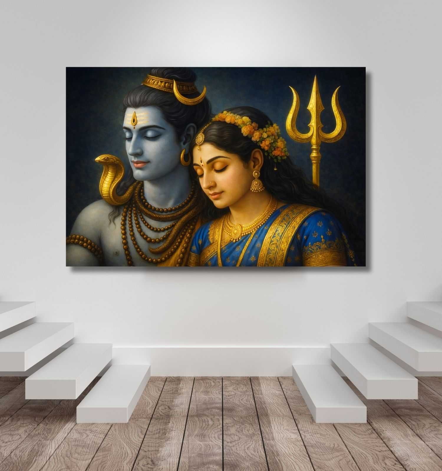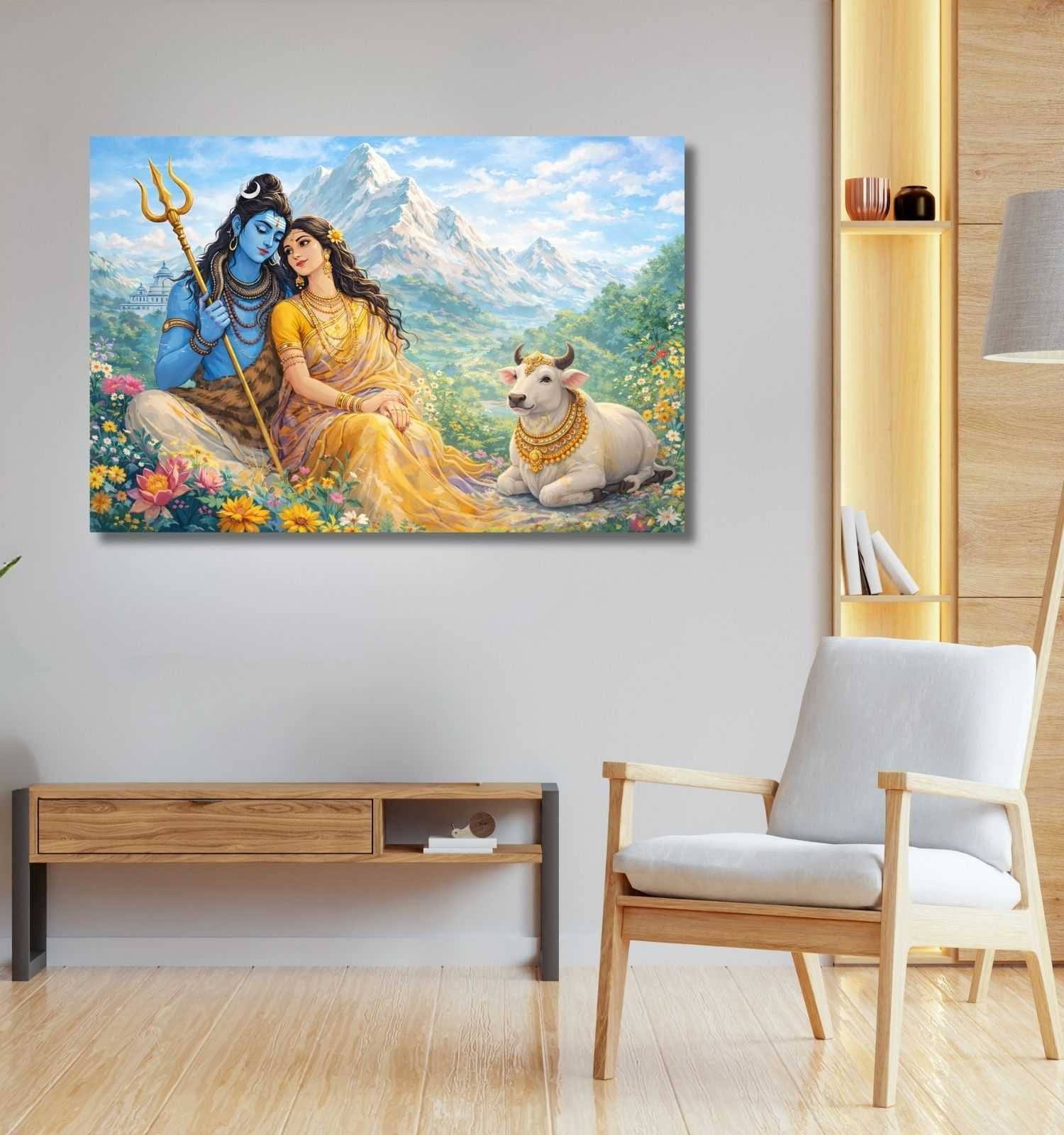 Bring positivity and elegance to your space with this modern art Shiv Parvati painting by KunjCart. The artwork showcases Lord Shiva and Goddess Parvati in a romantic aura, surrounded by blooming red and yellow flowers with a radiant golden background. The fine details, glowing shades, and divine expressions create a peaceful and spiritual vibe. Designed on 380 GSM premium canvas, this shiv parvati abstract painting ensures long-lasting durability, HD clarity, and vibrant shine. Perfect for home, office, or meditation areas, this Shiva Parvati painting is an ideal choice for spiritual wall décor.