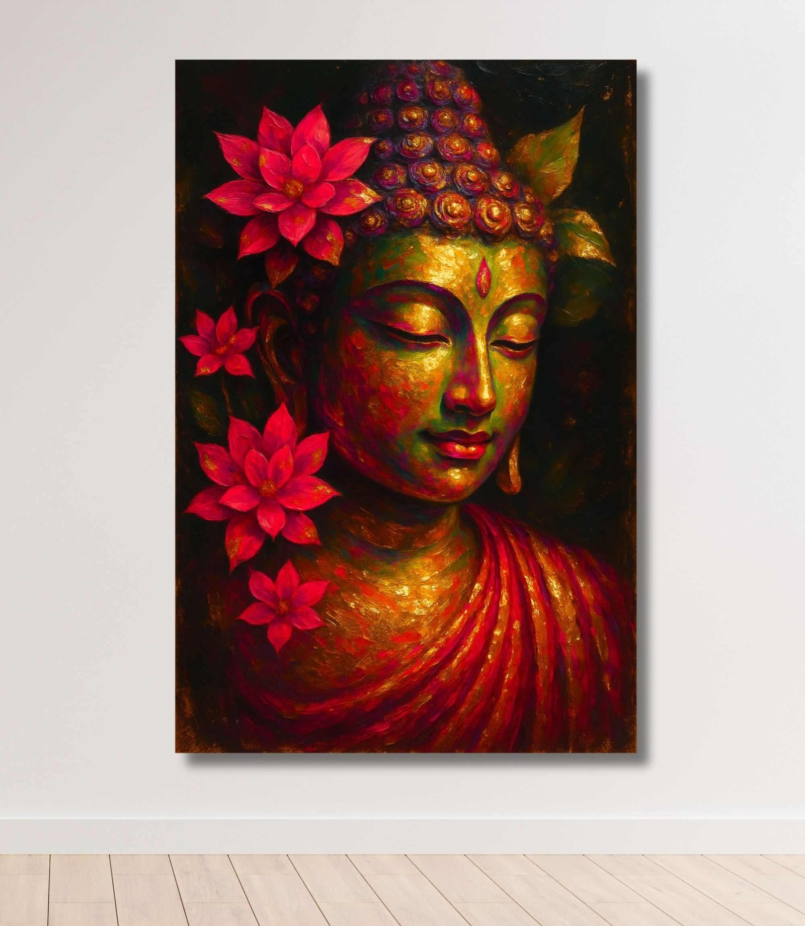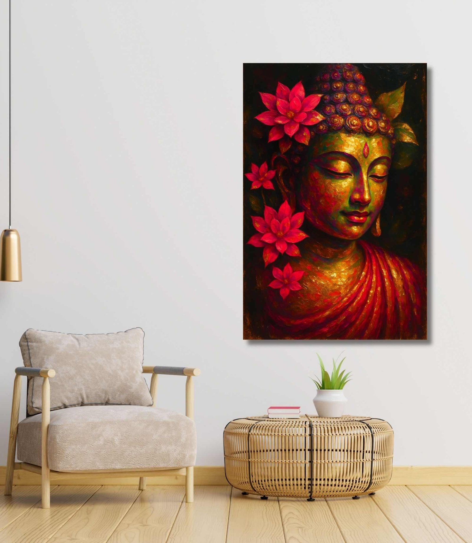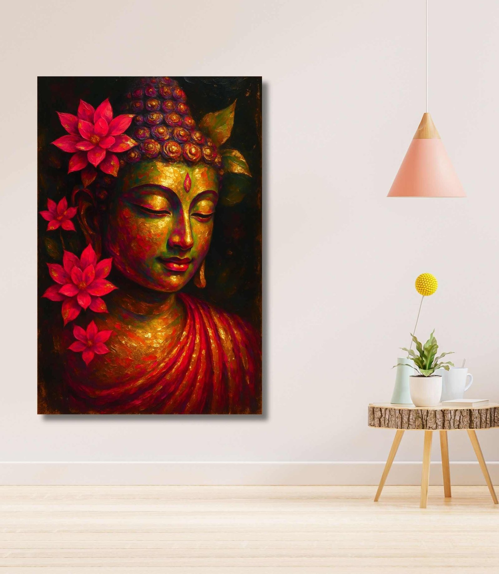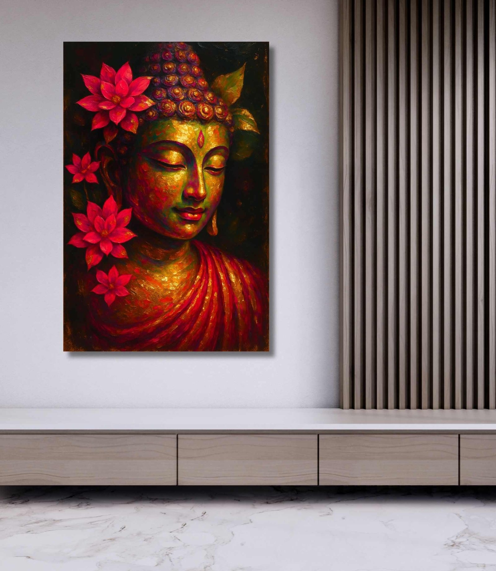 Bring serenity and vibrant energy to your space with this modern Buddha painting by KunjCart. This stunning artwork showcases a peaceful Gautam Buddha face with closed eyes, surrounded by radiant red lotus flowers. The painting is enriched with glowing gold, deep reds, and earthy shadows that add depth and divine elegance to the piece. The canvas captures the spirit of spiritual calm while offering a fiery aesthetic that stands out on any wall.