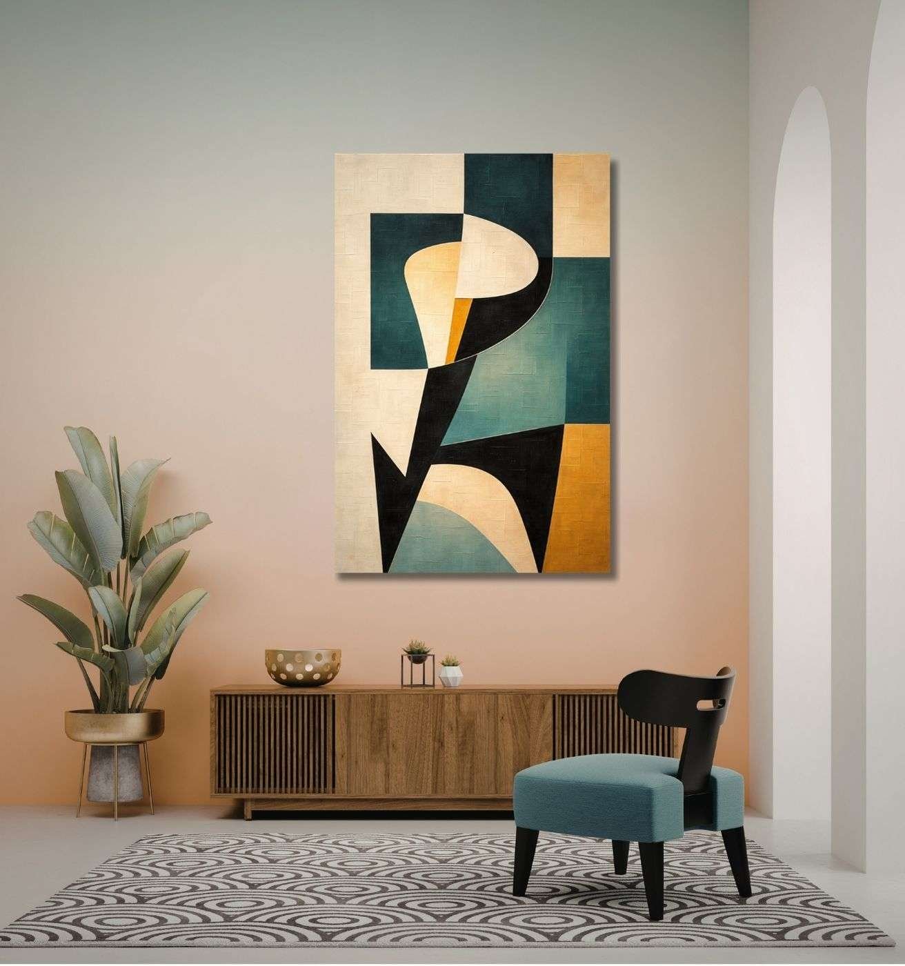 Transform your interior with this stylish Modern Painting For Living Room from KunjCart. The artwork features a bold geometric abstract design with sharp shapes and layered blocks in teal blue, beige, black, and warm golden tones. The structured composition and smooth curves create a modern artistic look that adds depth and elegance to contemporary spaces, similar to soft sunset highlights and modern architectural forms. Printed on high-quality 380 GSM durable canvas, the painting gives the feel of a real handmade artwork rather than wallpaper. KunjCart uses HD printing with waterproof, bright and long-lasting colors using premium ink for sharp detail. Available in framed and unframed options with multiple sizes and custom size choices.