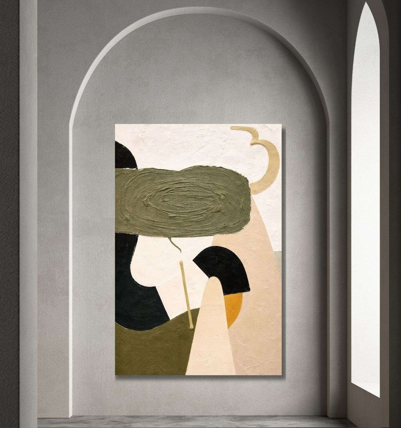 • Stylish Modern Art Canvas Painting featuring textured abstract shapes in olive green, beige, black and golden tones.