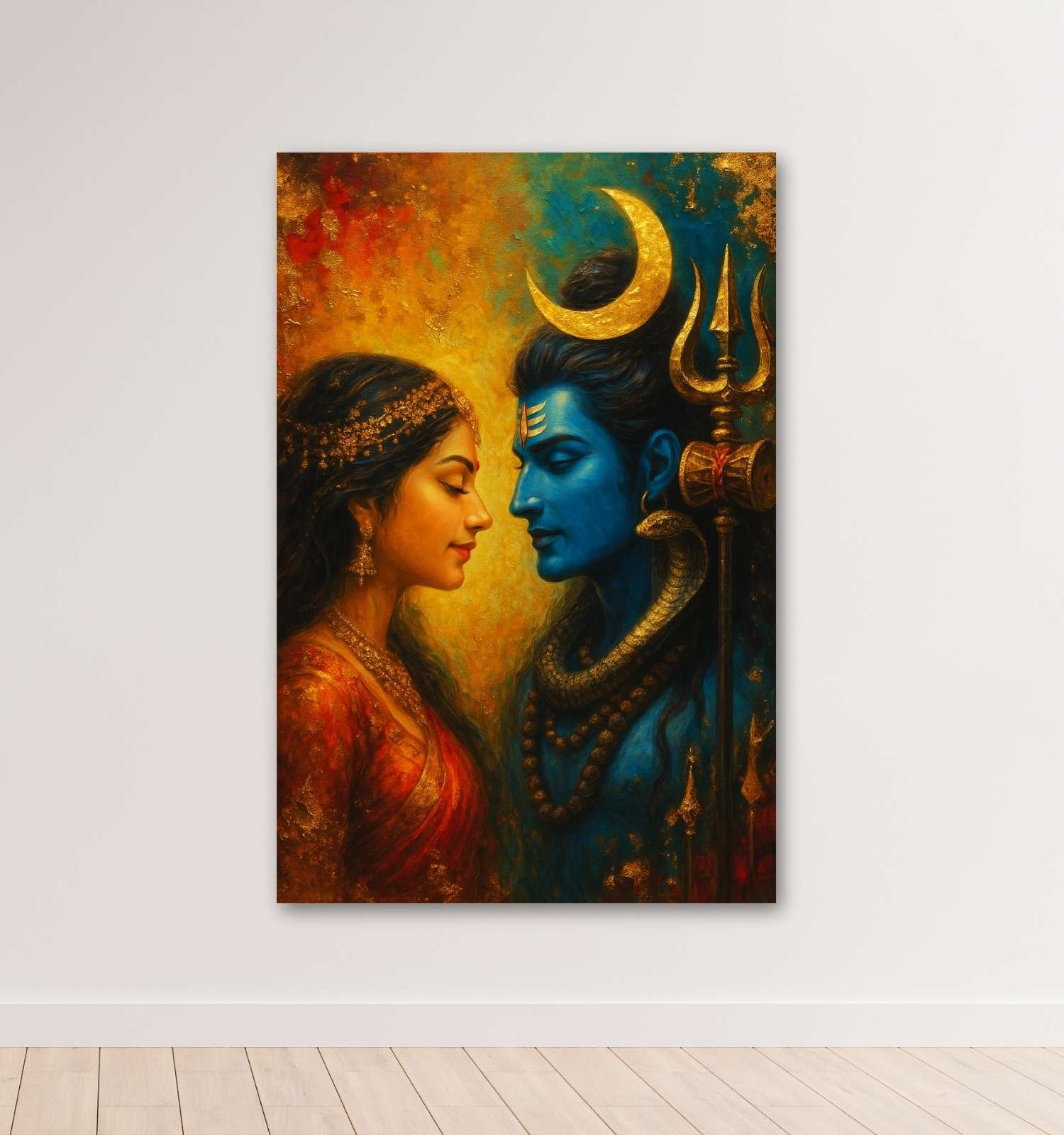 Elevate your space with this soul-touching Shiva Parvati Painting from KunjCart. This artwork radiates devotion and eternal love, featuring Lord Shiva in vibrant deep blue tones, adorned with Rudraksha mala, Trishul, crescent moon, and golden snake, standing peacefully with Goddess Parvati in glowing red-orange attire and golden jewelry. The background blends fiery yellow, warm orange, and twilight blue, giving it a divine sunset effect that enhances spiritual aura.