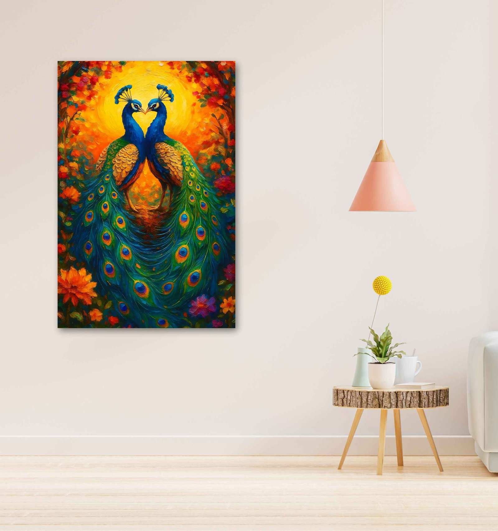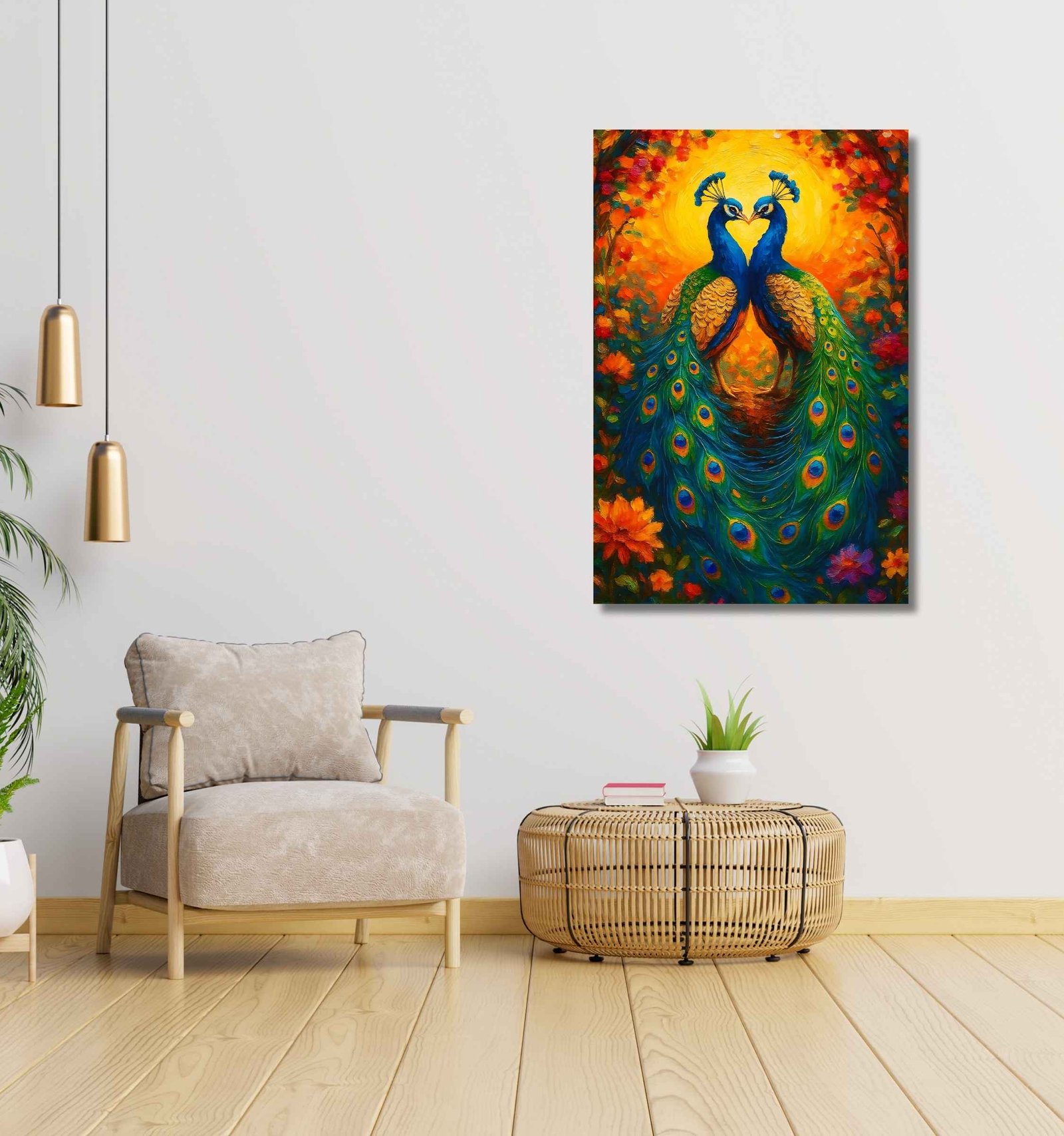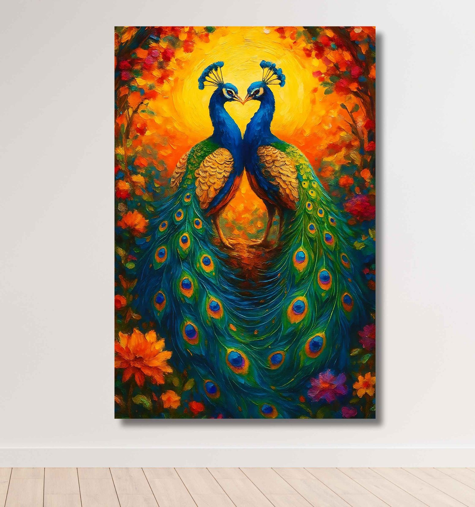 Decorate your home with grace and elegance using this Peacock Painting For Wall Vastu by KunjCart. This artwork features two beautiful peacocks facing each other, symbolizing harmony, love, and positivity. Their vibrant feathers spread wide, filled with detailed eye patterns in shades of blue and green, enhanced by a warm sunset golden glow in the background and surrounded by bright flowers in red, orange, and violet hues.