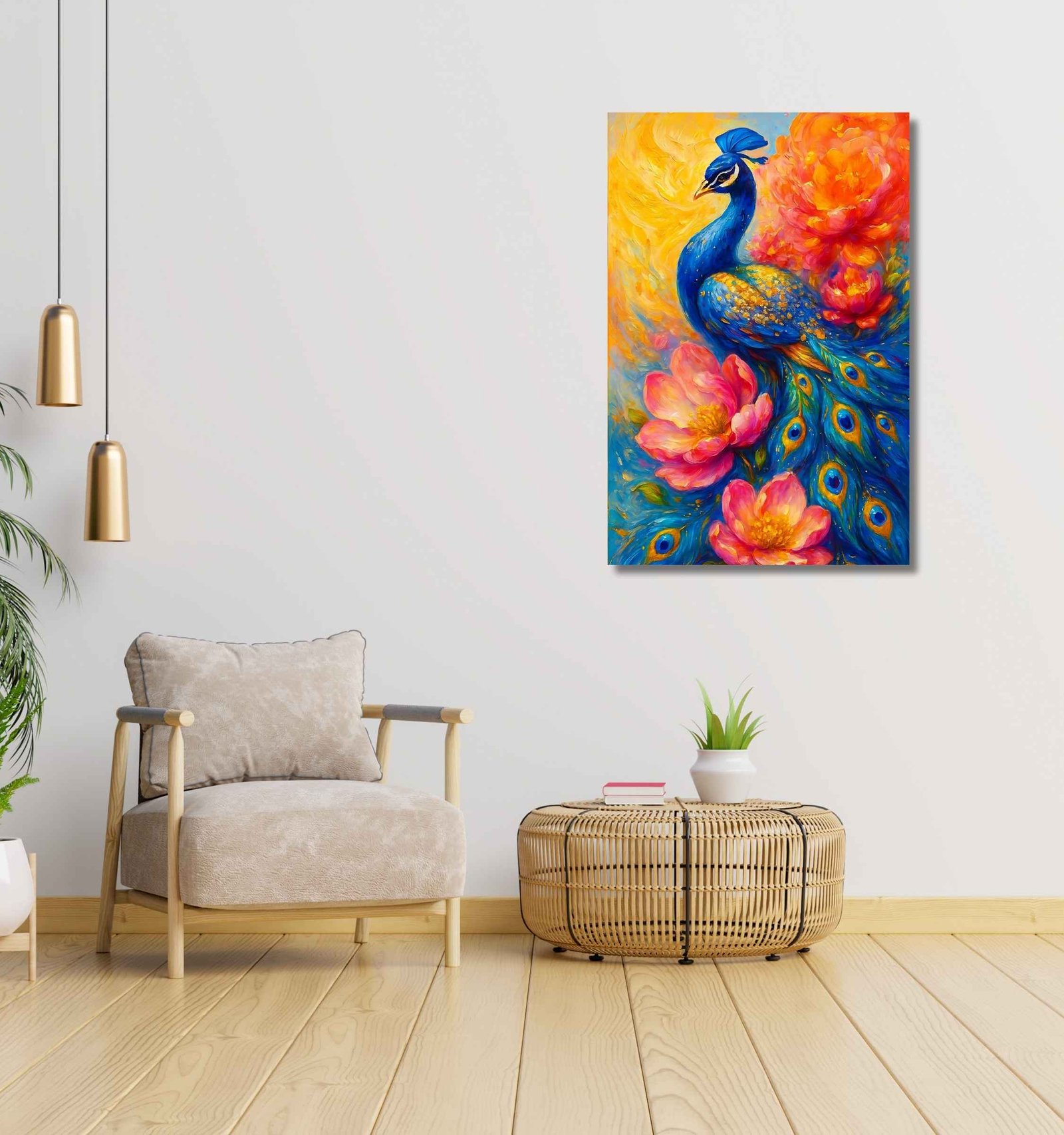 Bring prosperity, positivity, and charm to your living space with this stunning Peacock Painting For Wall Vastu by KunjCart. This masterpiece showcases a vibrant blue peacock surrounded by blooming pink lotuses and golden feather accents, all set against a warm yellow-orange backdrop, symbolizing joy, energy, and grace. The painting reflects a perfect vastu balance and adds elegance to any corner.